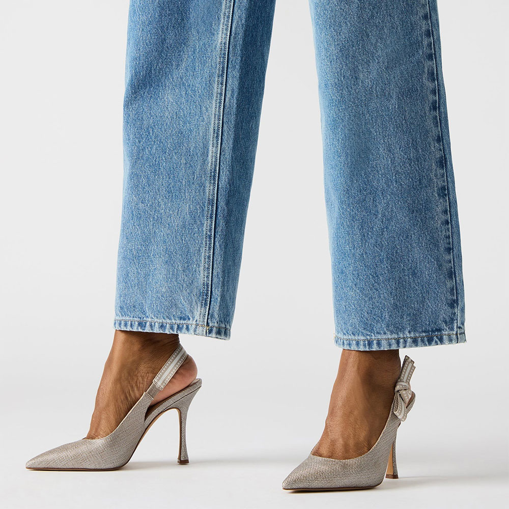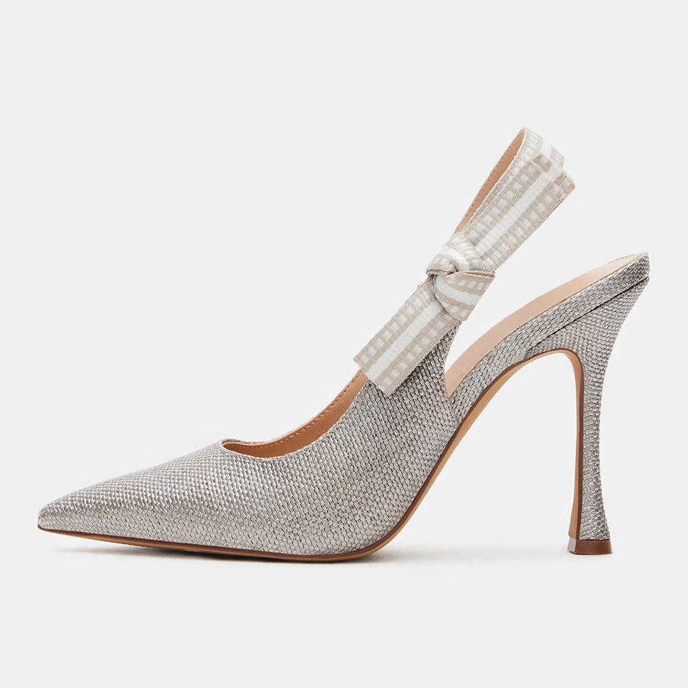 Special Designs: The silver pumps feature a pointed toe, a stiletto heel, and a slingback strap with a bow accent.