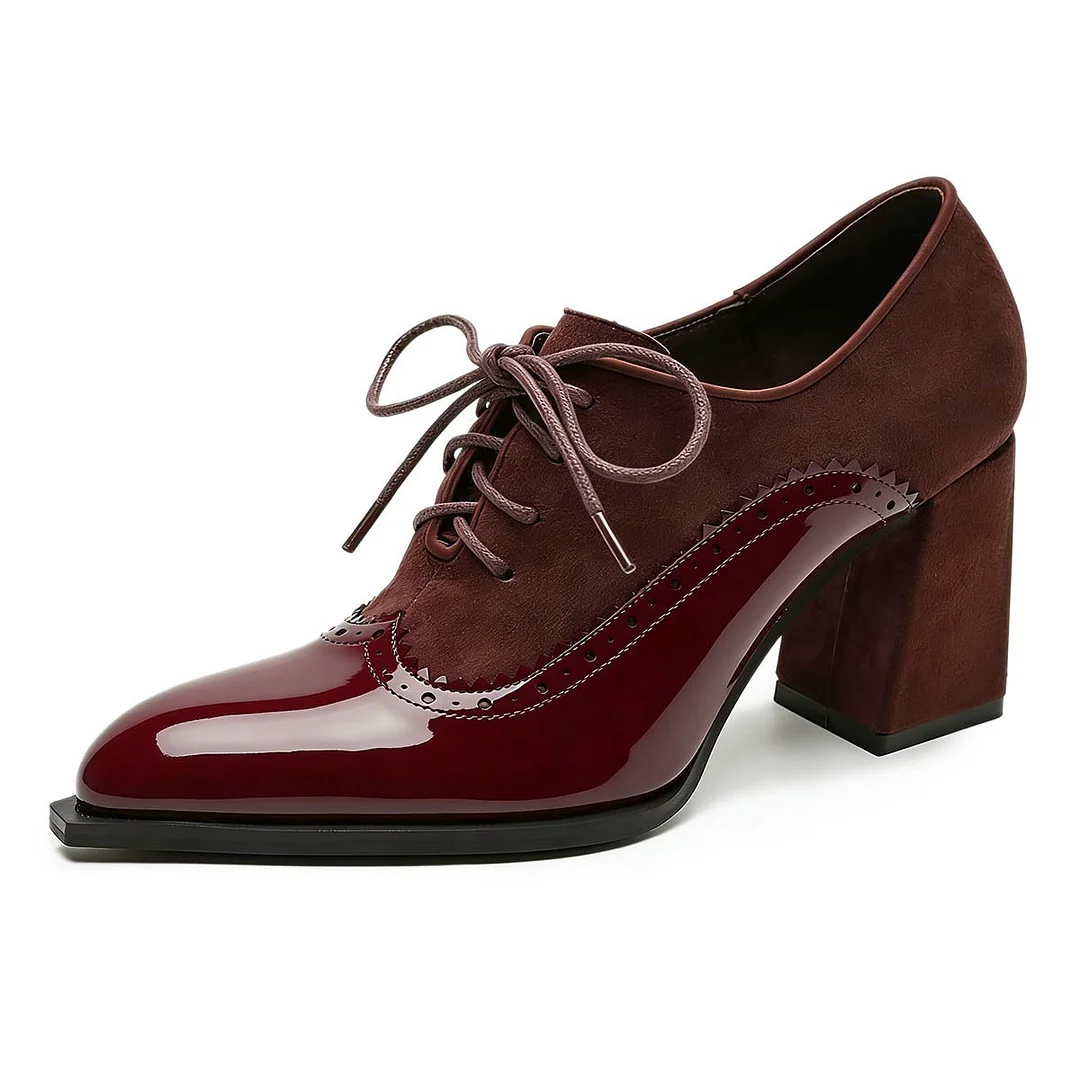 Fashion Maroon Pointed Toe Chunky Heel Lace Up Womens Oxfords