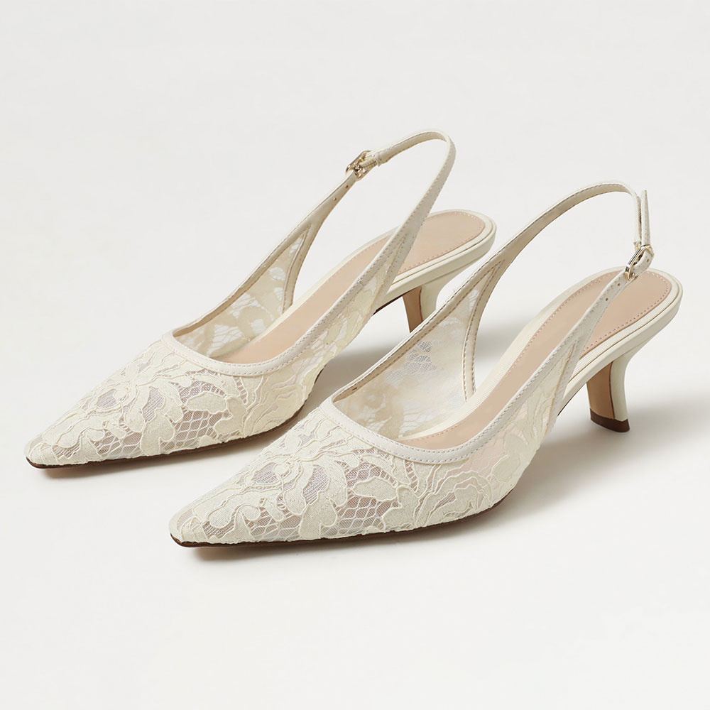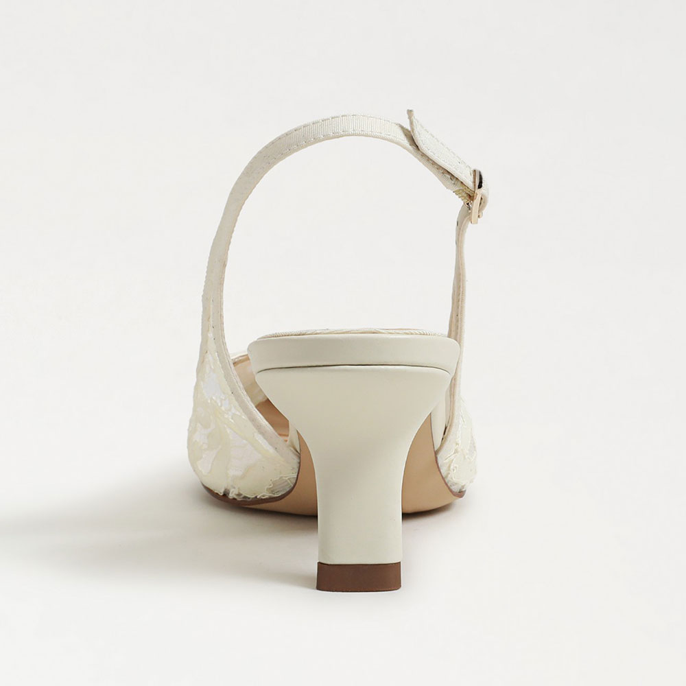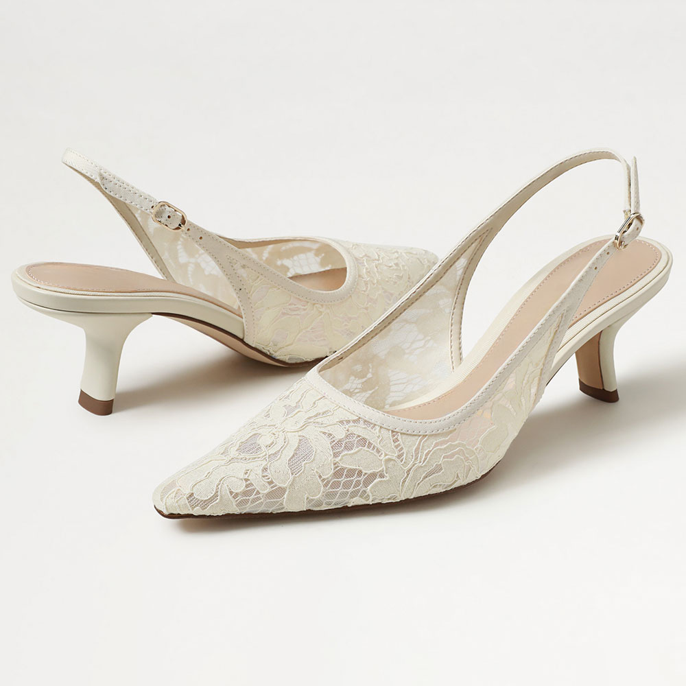 Special Designs: The ivory slingback pumps feature an embroidered and chunky heel design with a pointed toe.