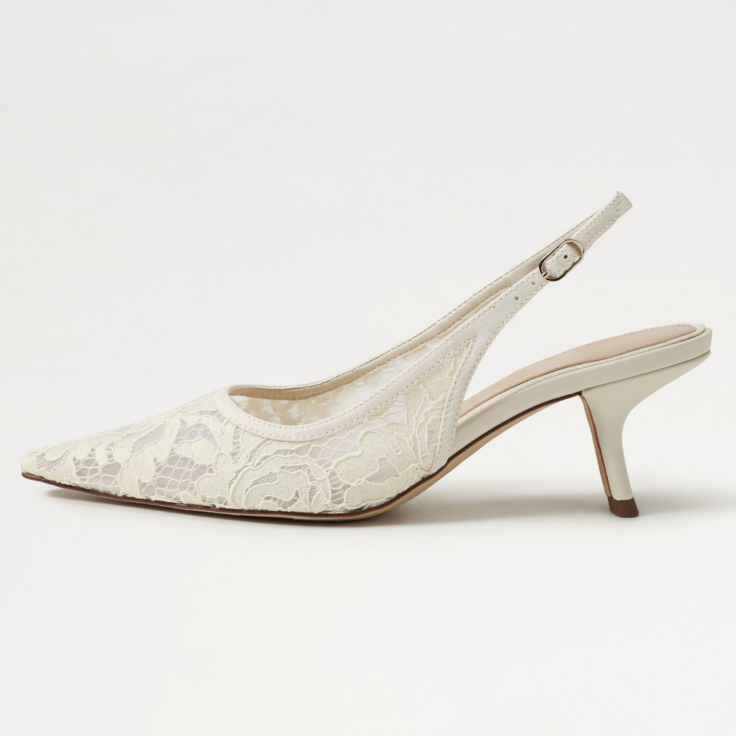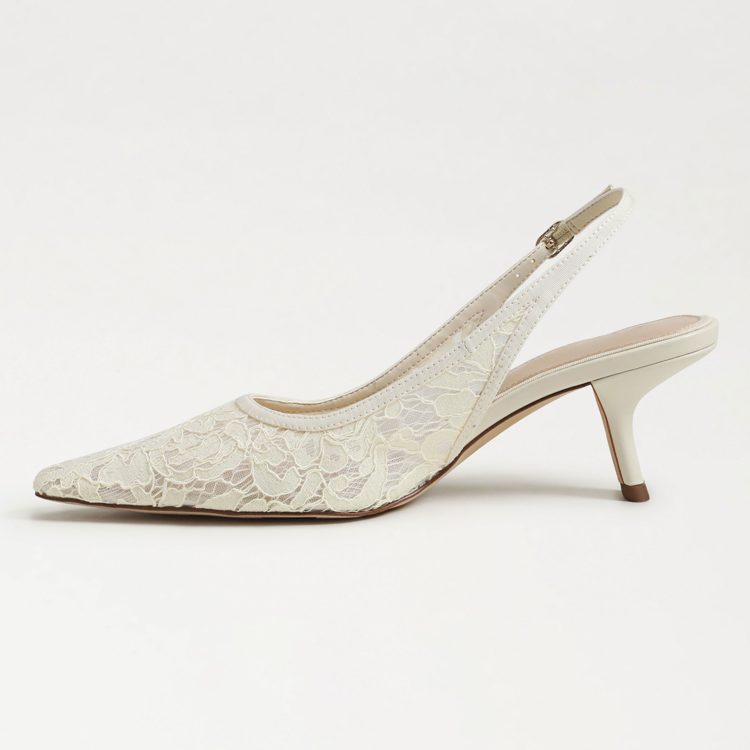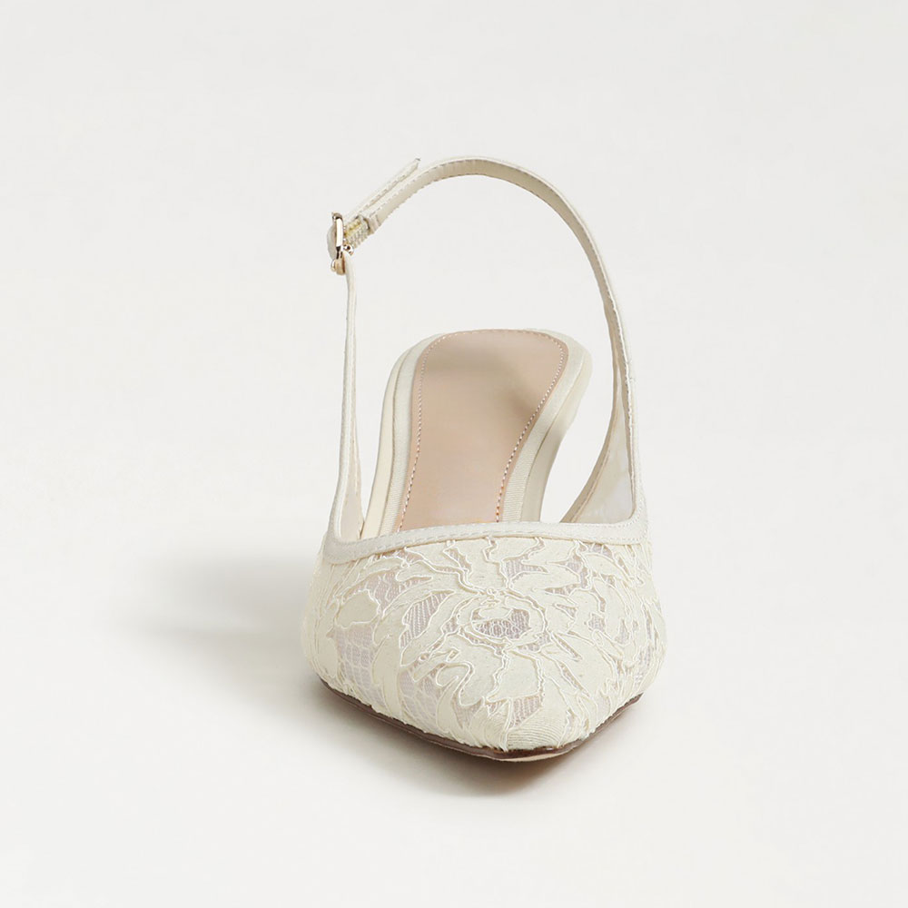 Special Designs: The ivory slingback pumps feature an embroidered and chunky heel design with a pointed toe.