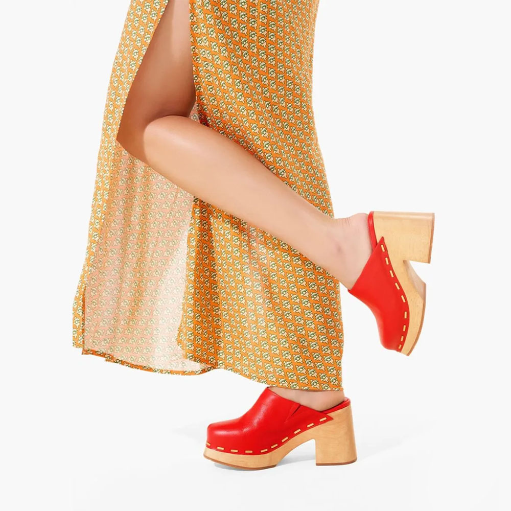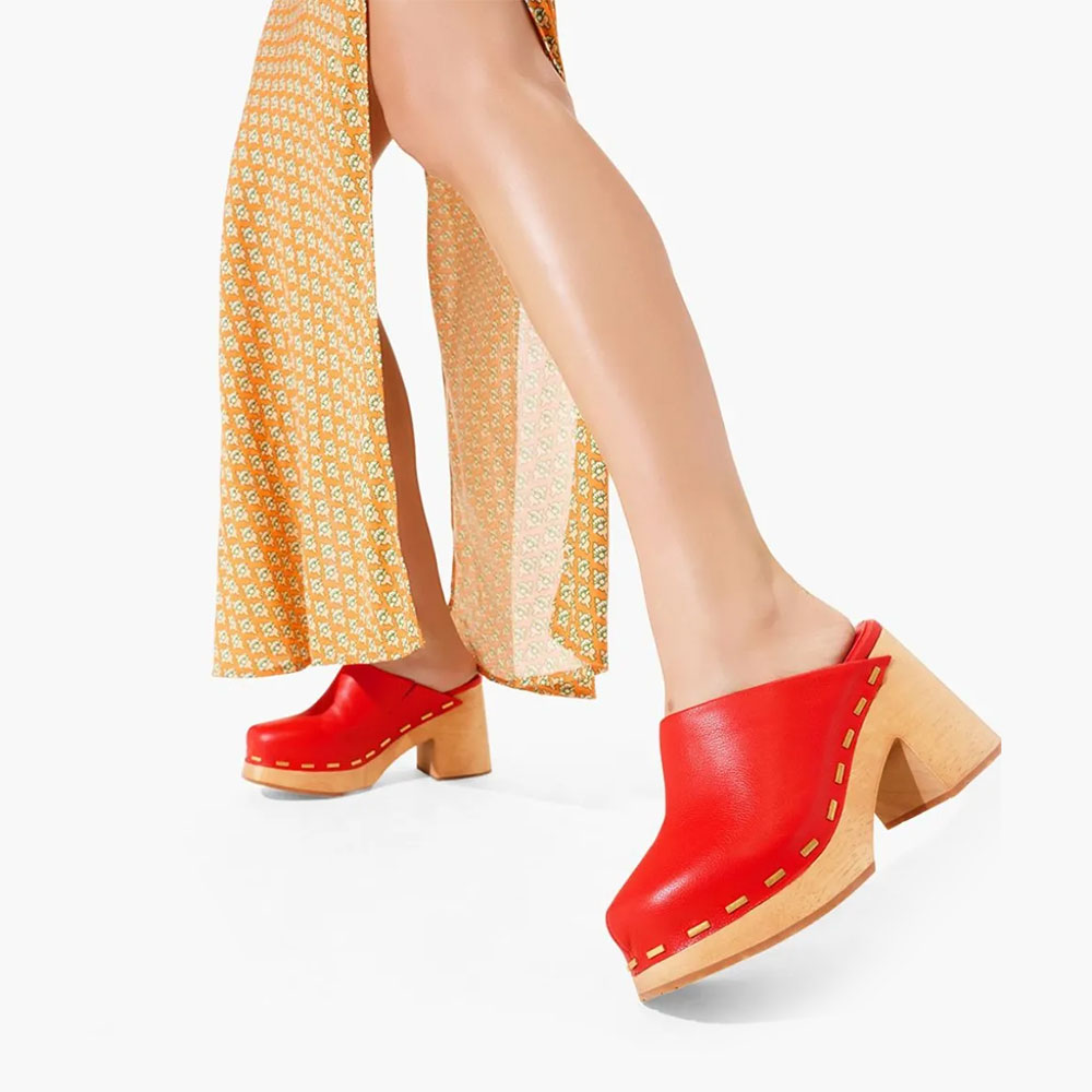 Special Designs: The red platform mules feature a square toe, a chunky high heel, and golden stitching.