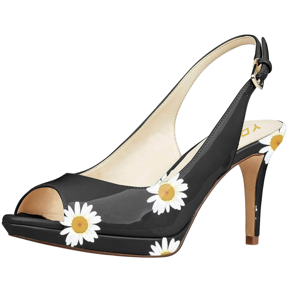Special Designs: Black sandals featuring a ivory floral printed inlay, buckle fastening slingback strappy design and a bold platform