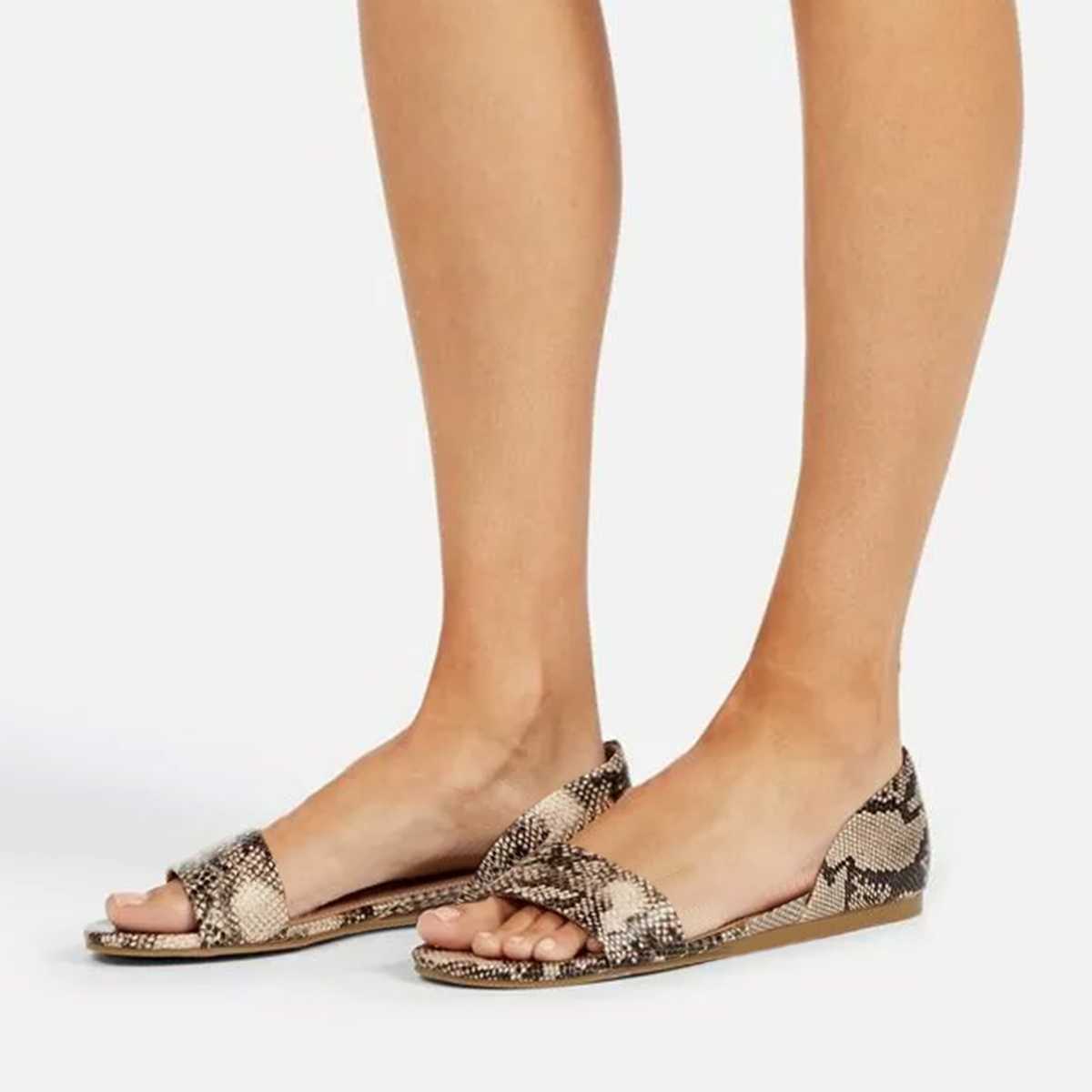Special Designs: Taupe python printed flat sandals with slip-on convenience.