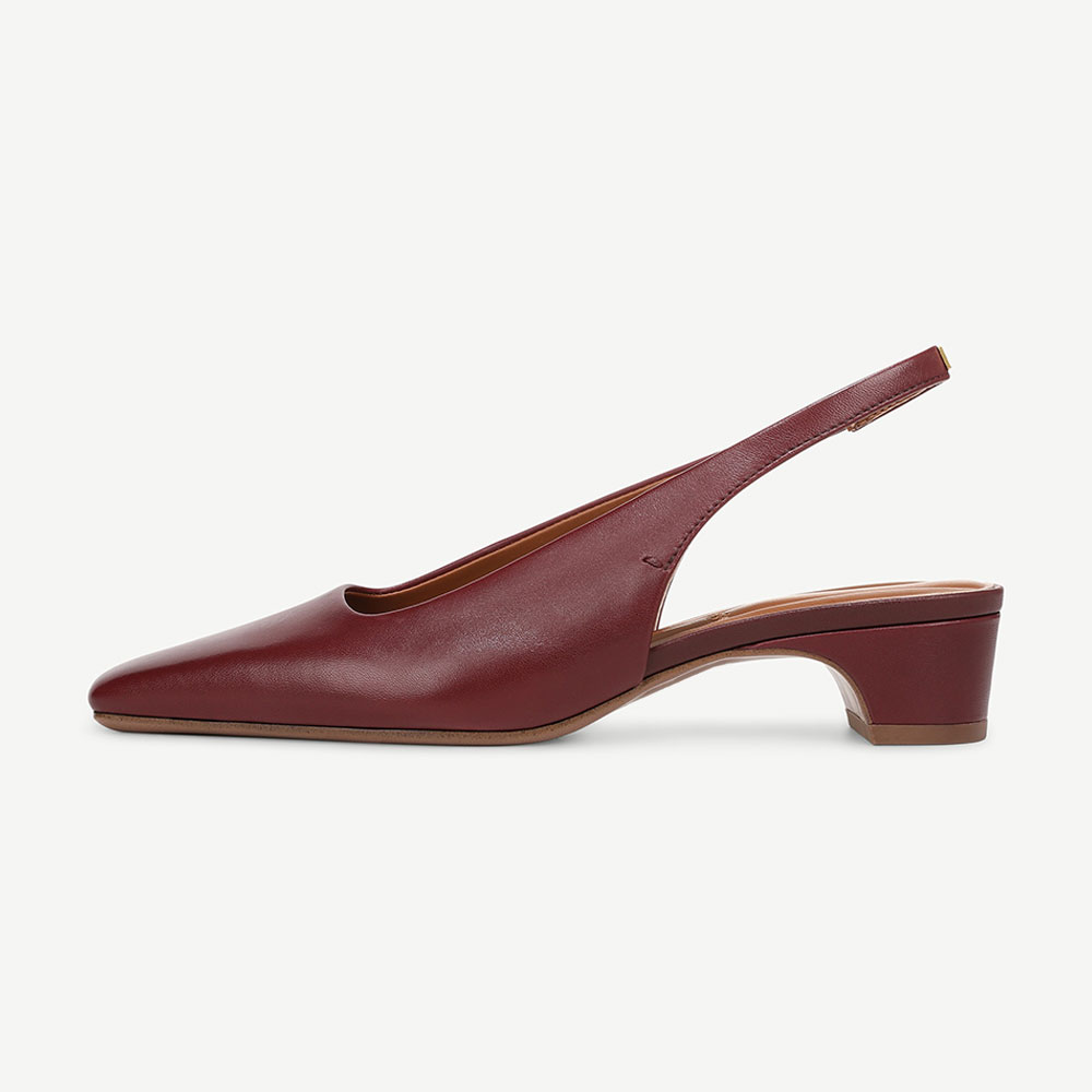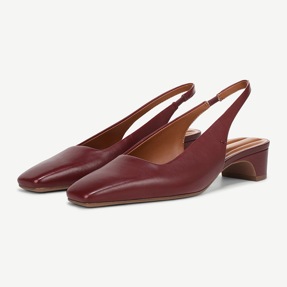 • Special Designs: The square-toe slingback pumps feature a chunky heel and a stretch strap for easy wear.