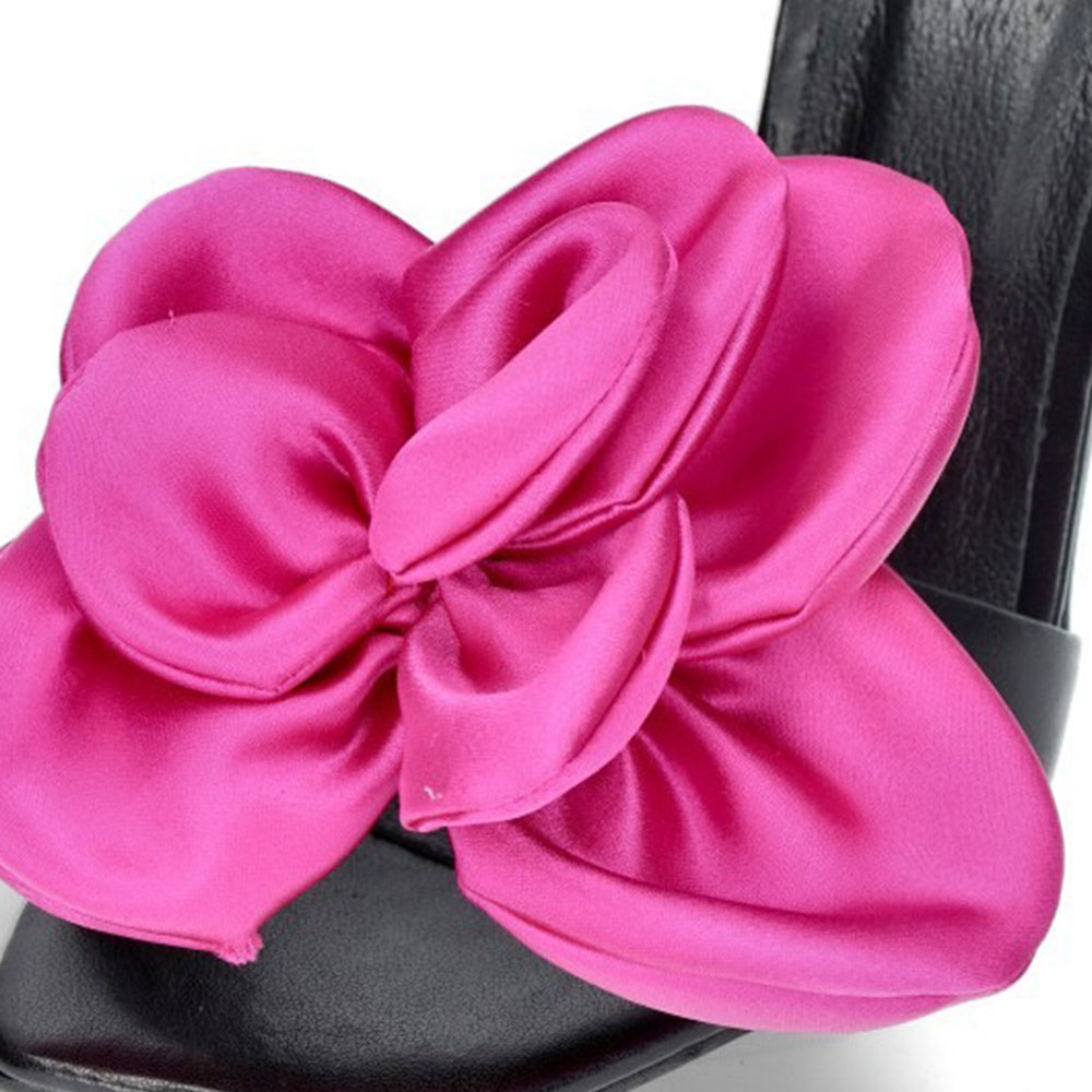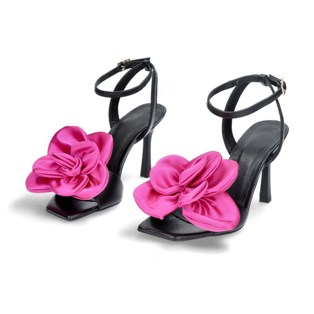 toe, a fuchsia front flower, an adjustable buckle, and an ankle strap design.