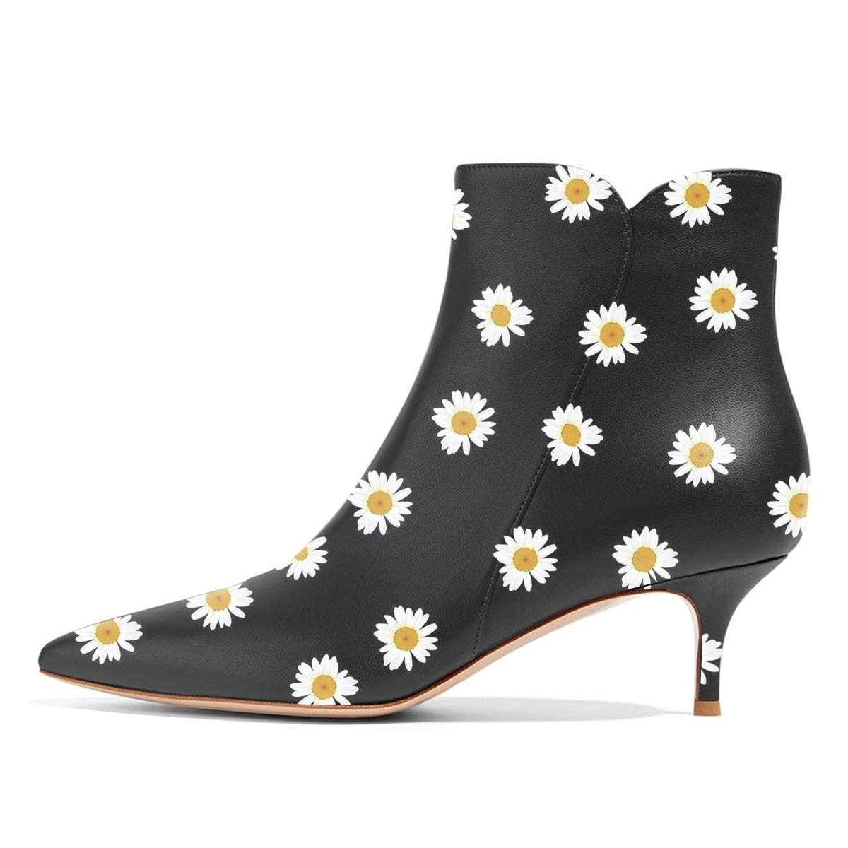 Special Designs: The ankle boots feature a sleek black faux leather design adorned with a playful daisy print, a side zipper closure, and a kitten heel.