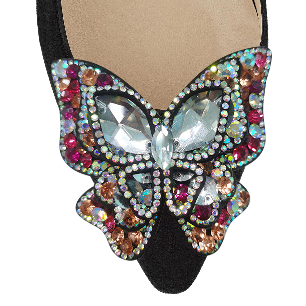Faux Suede Black Pointed Toe Colorful Rhinestone Butterfly Pumps