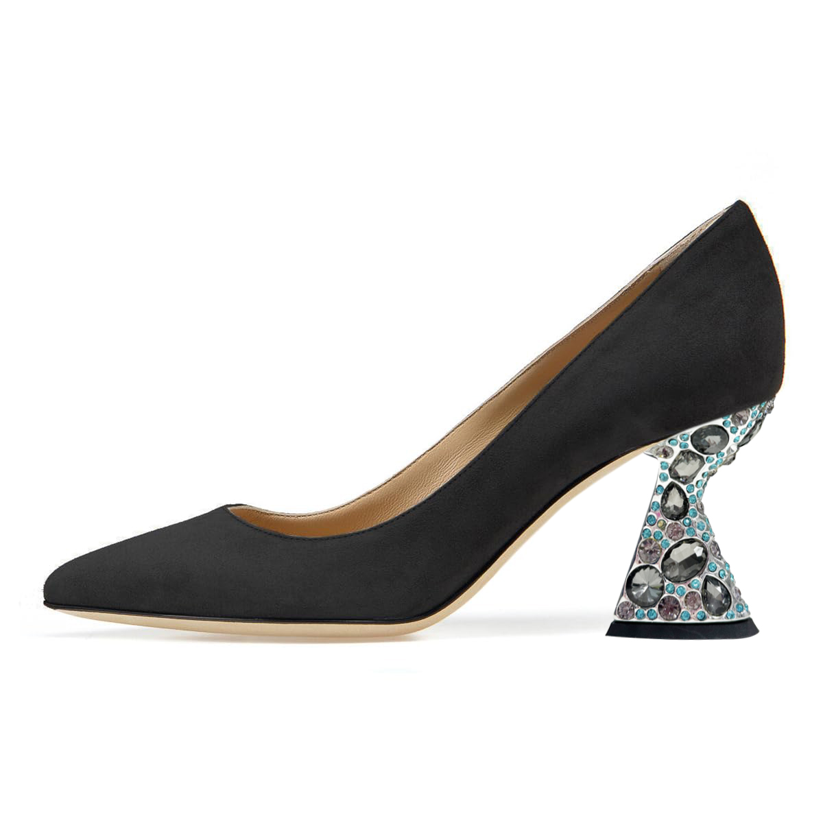 Faux Suede Black Pumps with Colorful Rhinestone Embellished Heels