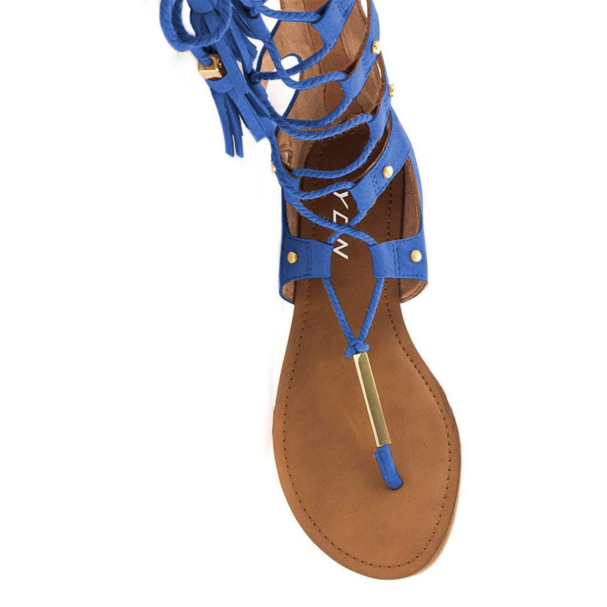Special Designs: Blue knee-high gladiator boots featuring a lace-up design, stud embellishment and back zip closure