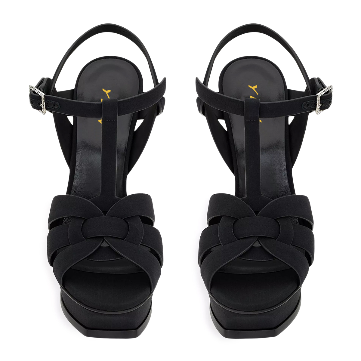 Special Designs: Black sandals feature an adjustable T-strap and bold platform.