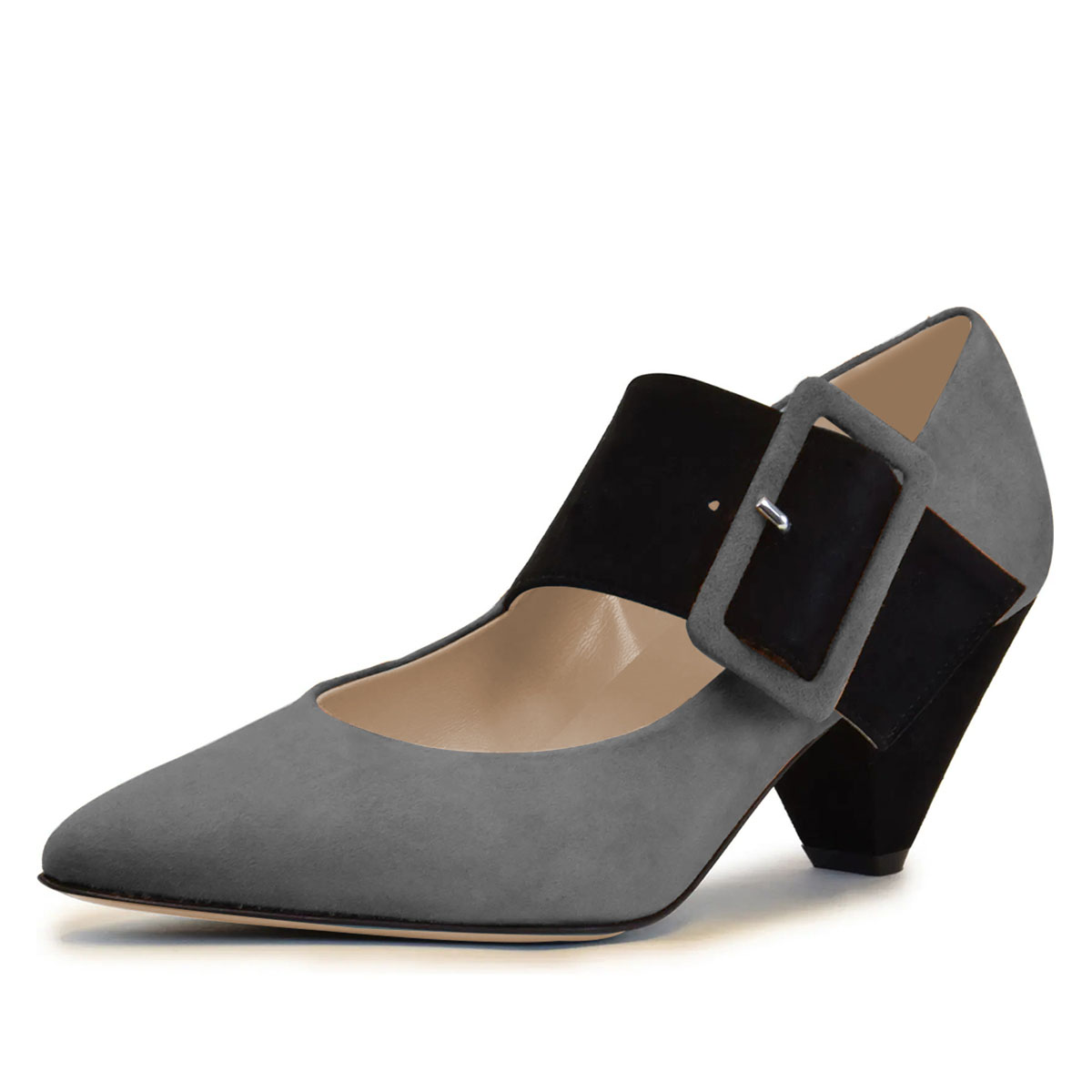 Special Designs: Gray pumps with faux suede sophistication and a buckle fastening black wide strap design
