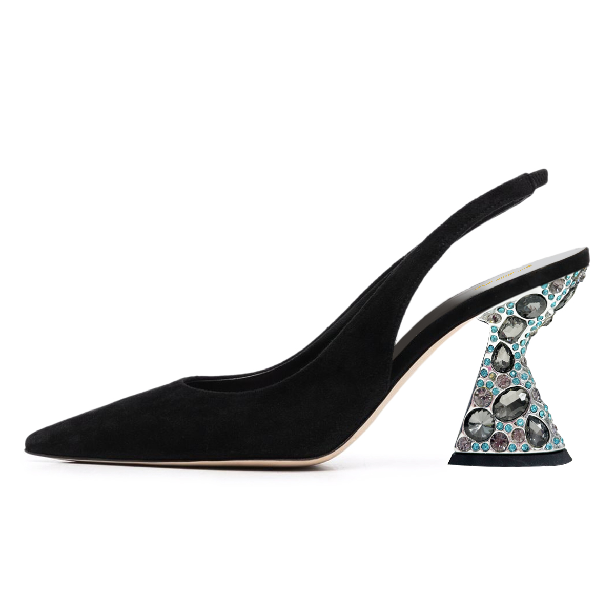 Special Designs: Black pumps feature a colorful rhinestone embellished heel and slingback pattern.