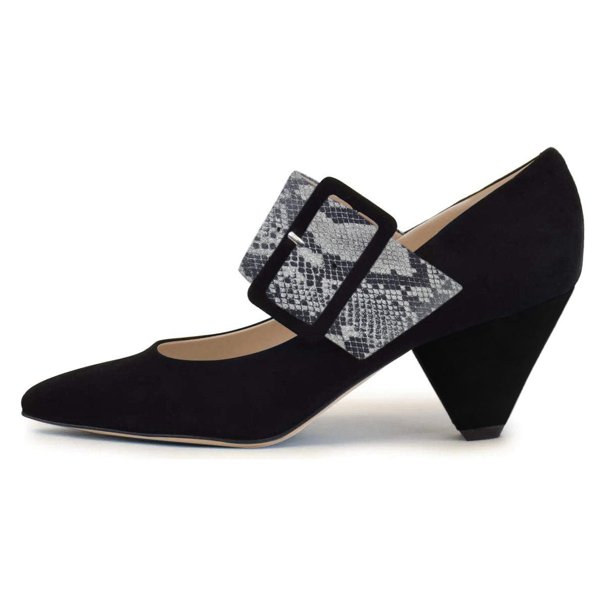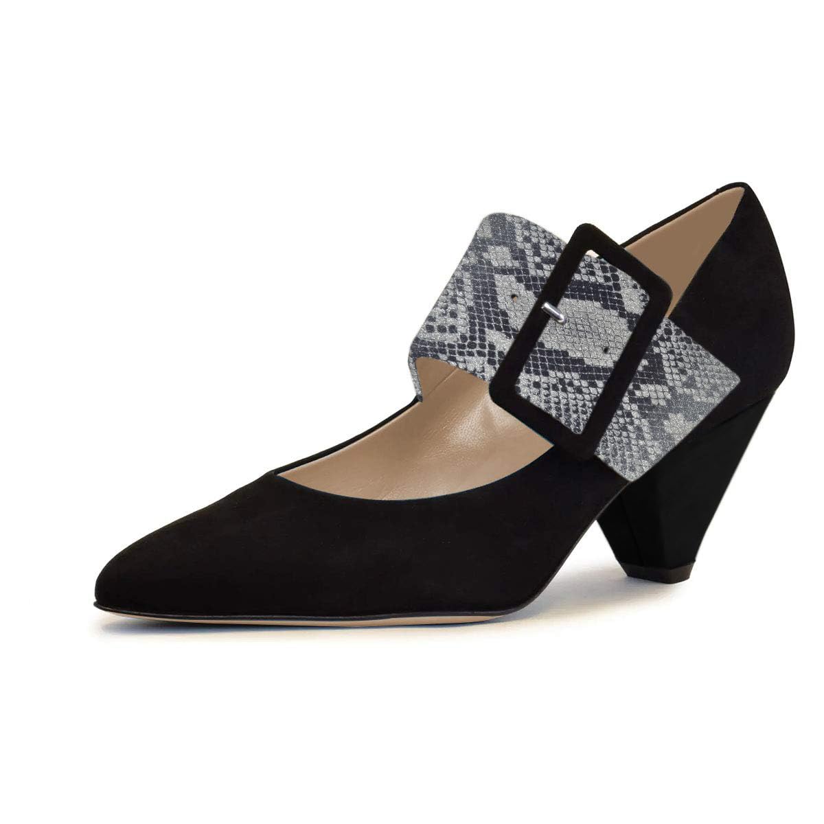 Special Designs: Black pumps with faux suede sophistication and a buckle fastening python wide strap design