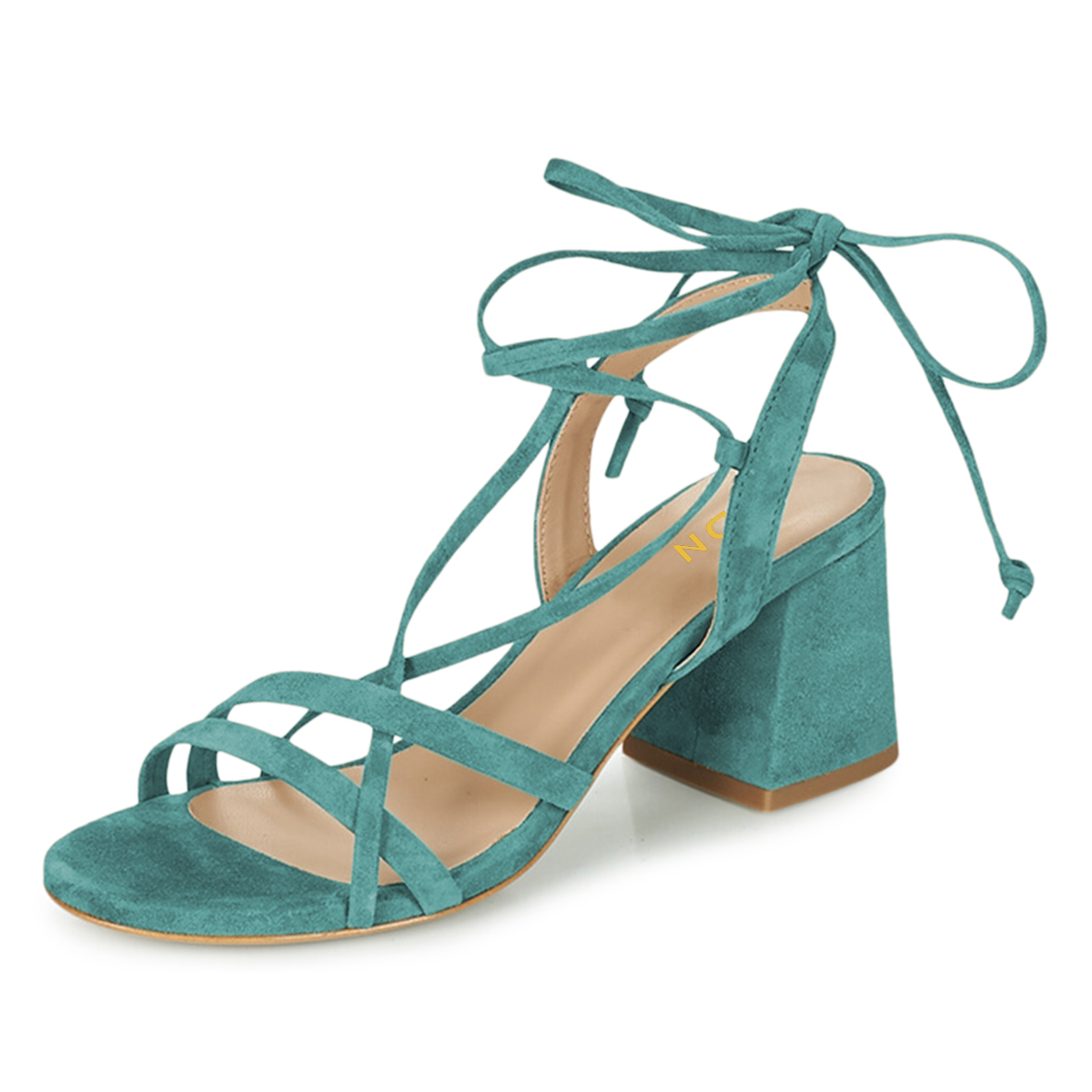 Faux Suede Round Toe Lace-Up Chunky Heel Sandals in Turquoise