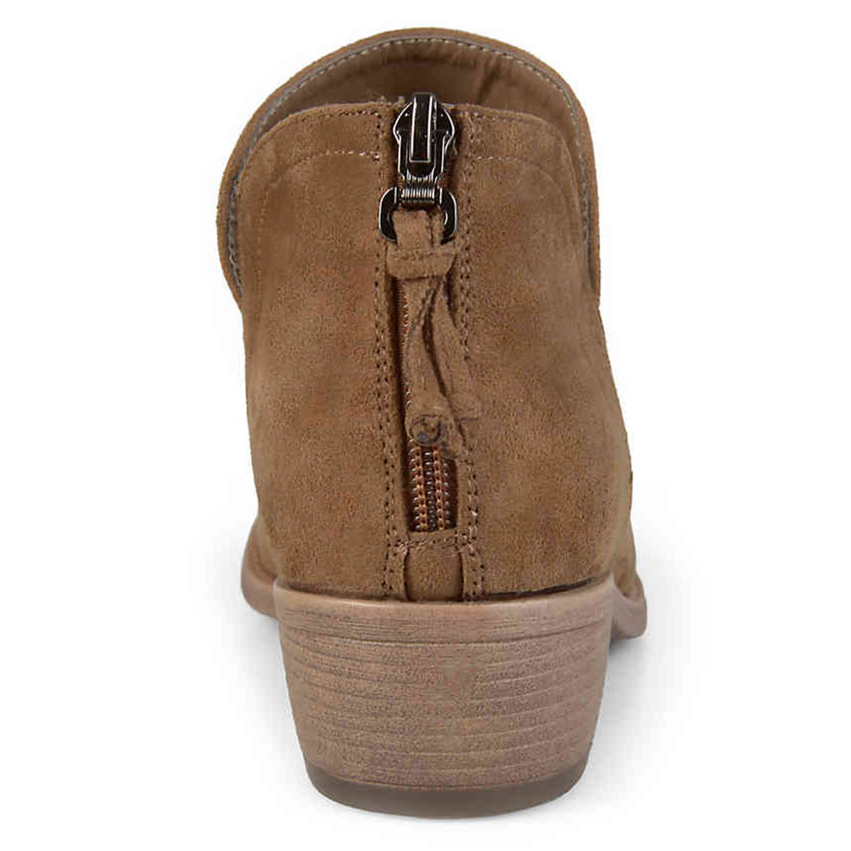 • Special Designs: Brown booties with classic block heel and back-zip closure.