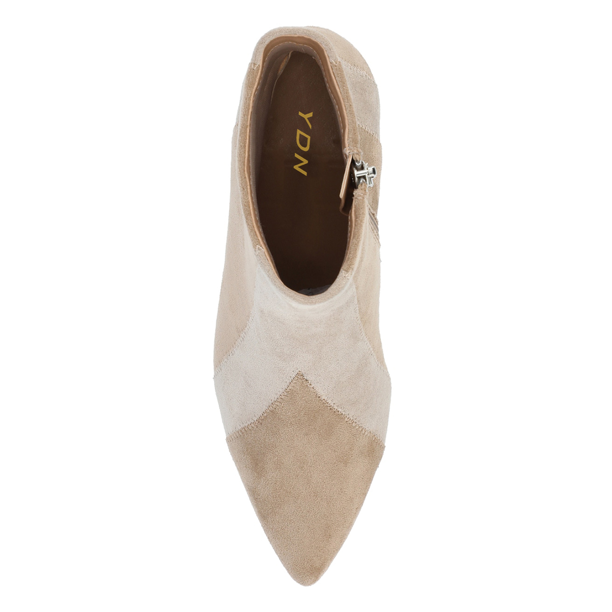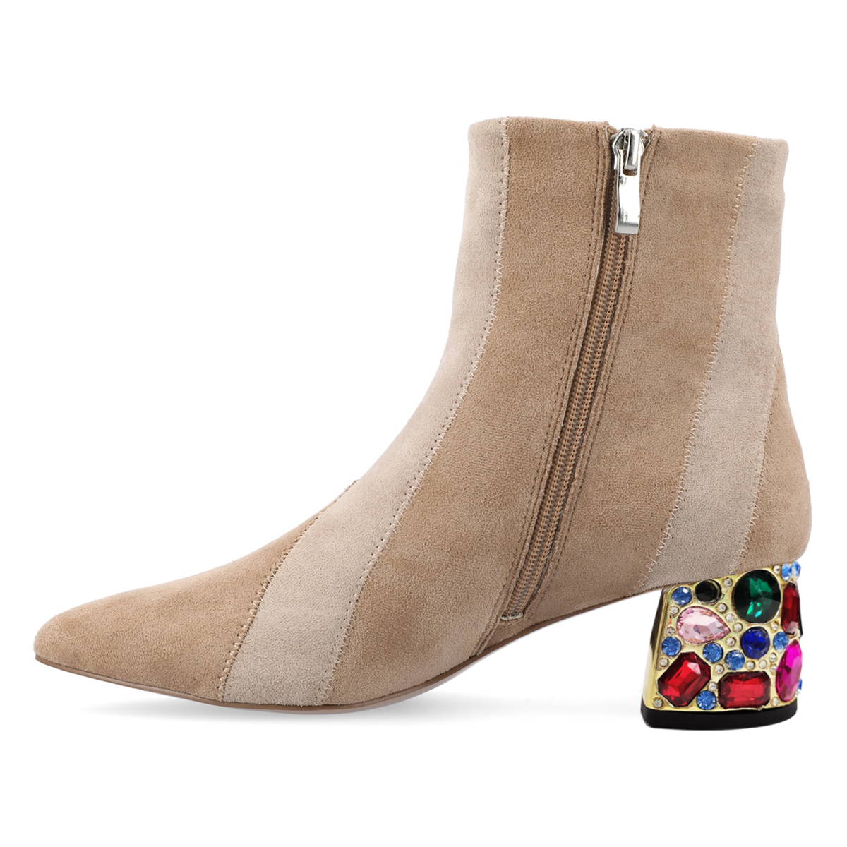 • Special Designs: Beige two tone ankle boots with faux suede sophistication, side-zip closure and a rhinestone embellished block heel