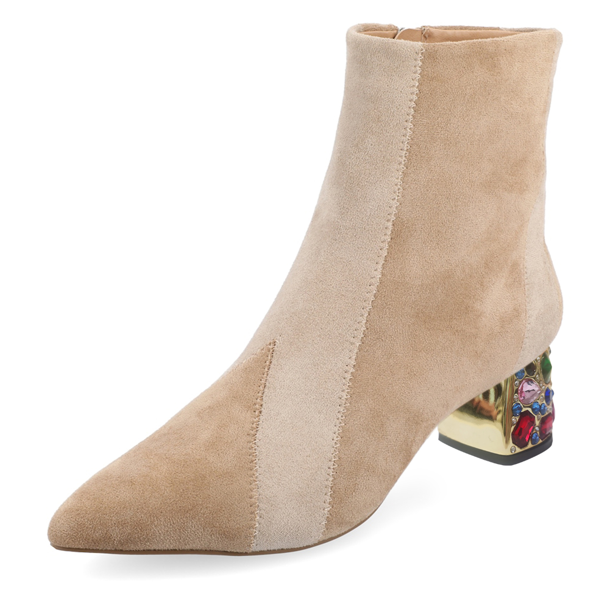 Faux Suede Two Tone Rhinestone Embellished Beige Ankle Boots