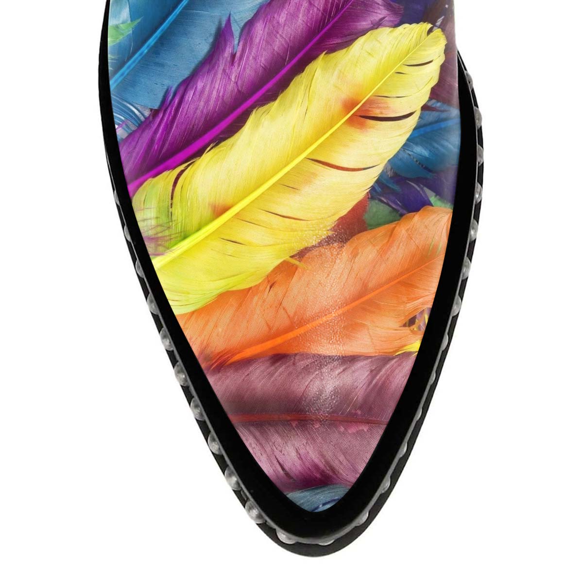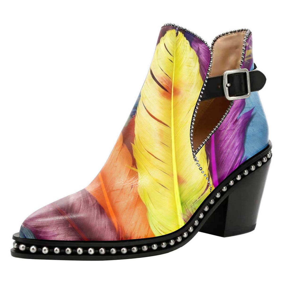 • Special Designs: The pointed-toe chunky heel short boots feature chic studs decorated, a colorful feather print, and an adjustable buckle strap for easy wearing.