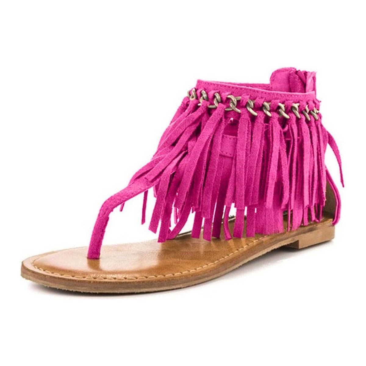 Fuchsia Round Toe Boho Flip Flop Chain Tassel Flat Sandals for Women