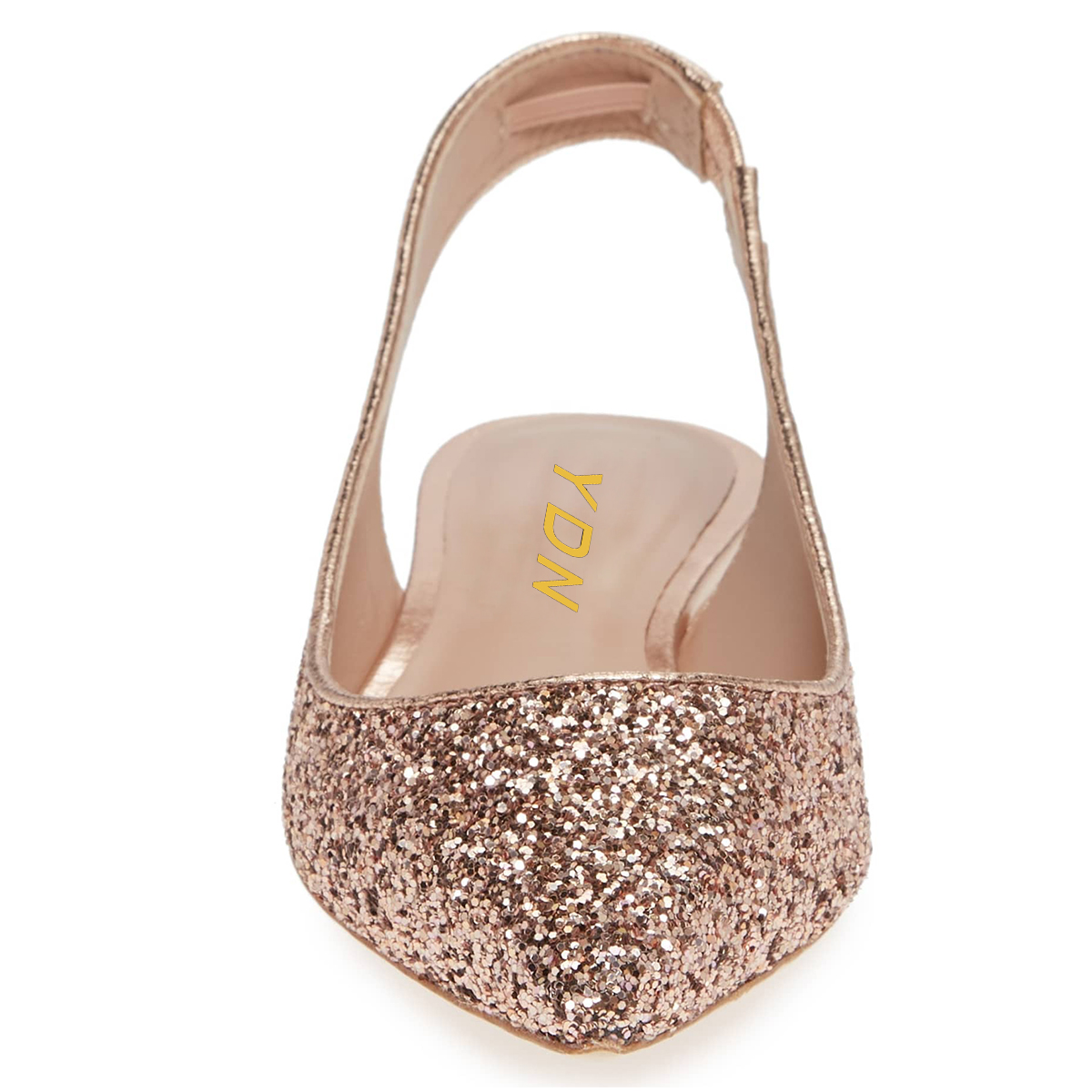 Special Designs: Rose gold comfortable slingback flat pumps with slip-on convenience and glittery touch.