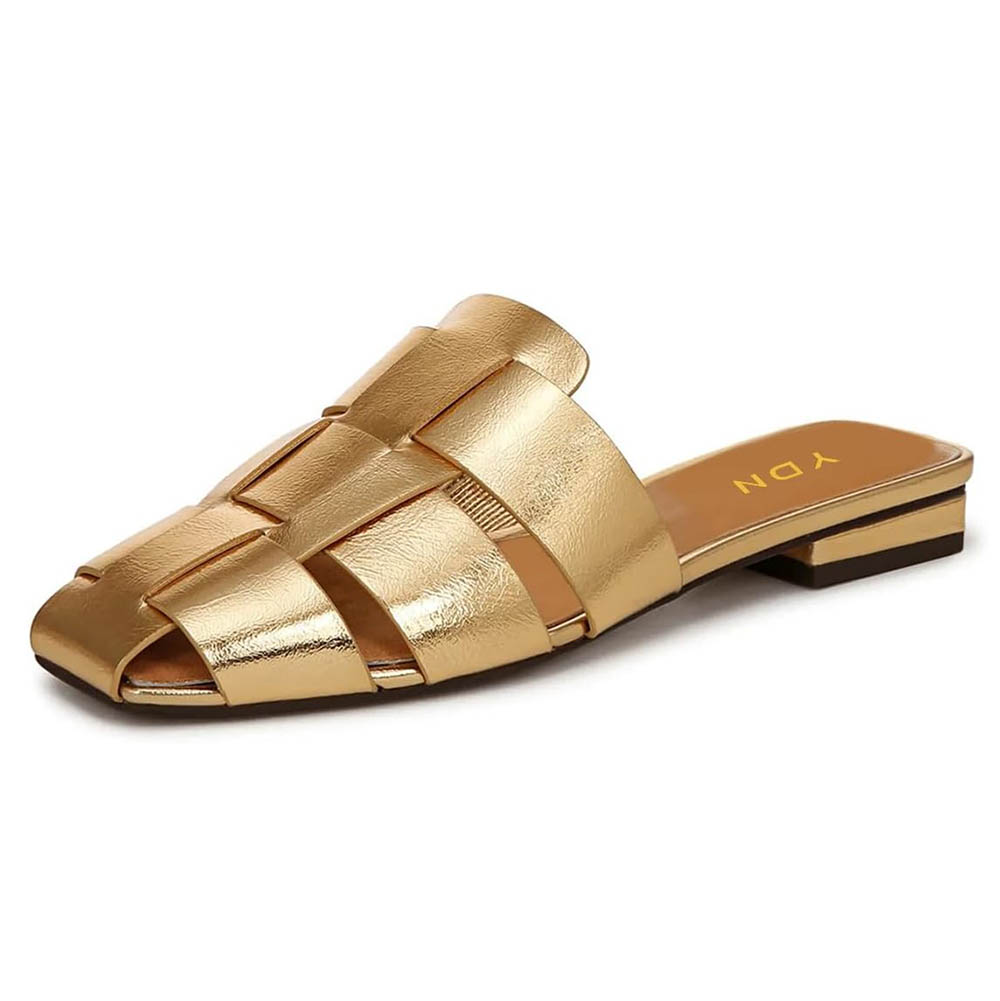 Gold Metallic Finish Square Toe Woven Flat Mule Shoes for Women