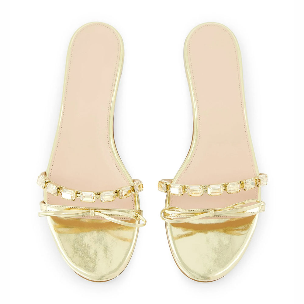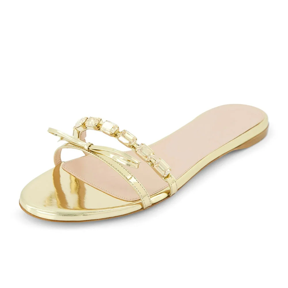 Gold Metallic Round Toe Flat Rhinestone Slides for Women with Bow