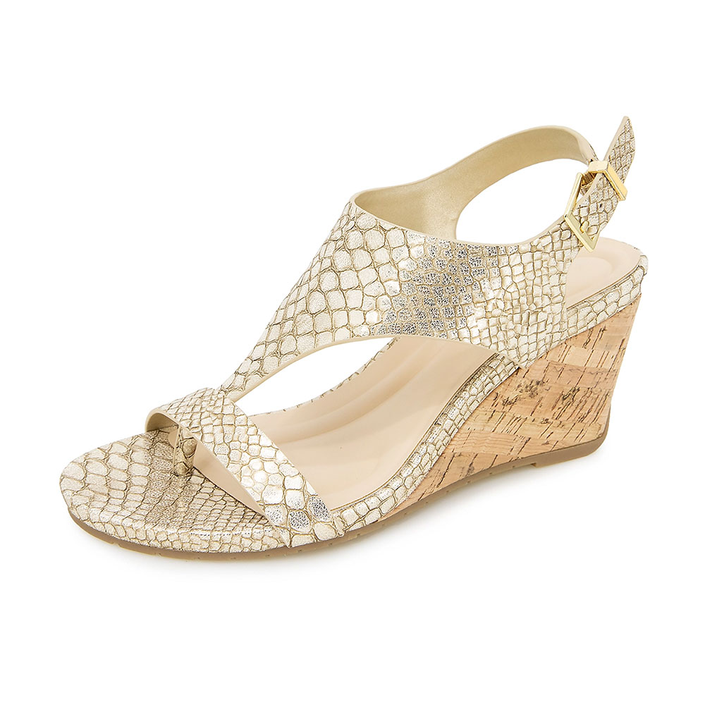 Gold Snakeskin Pattern T-Strap Buckle Wedge Heel Women Sandals