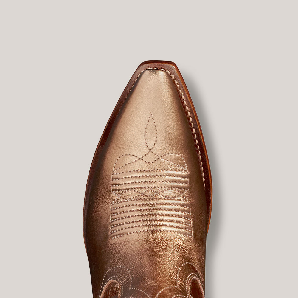 Special Designs: The gold cowgirl boots feature intricate western-style embroidery, a snip toe, and chunky heels.
