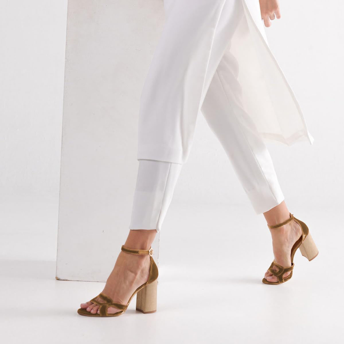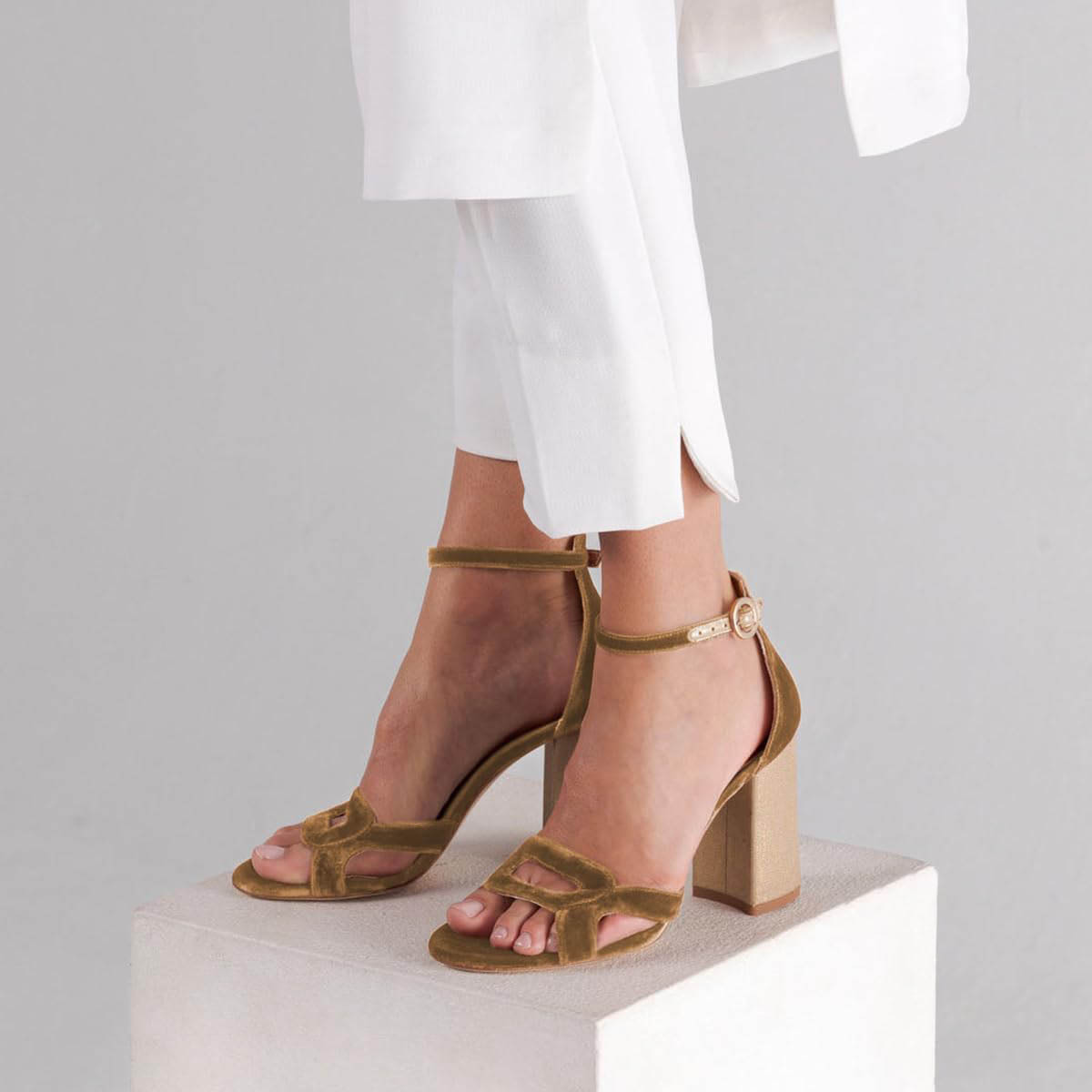 Gold Velvet Open Toe Chunky Heel Women's Sandals with Ankle Strap
