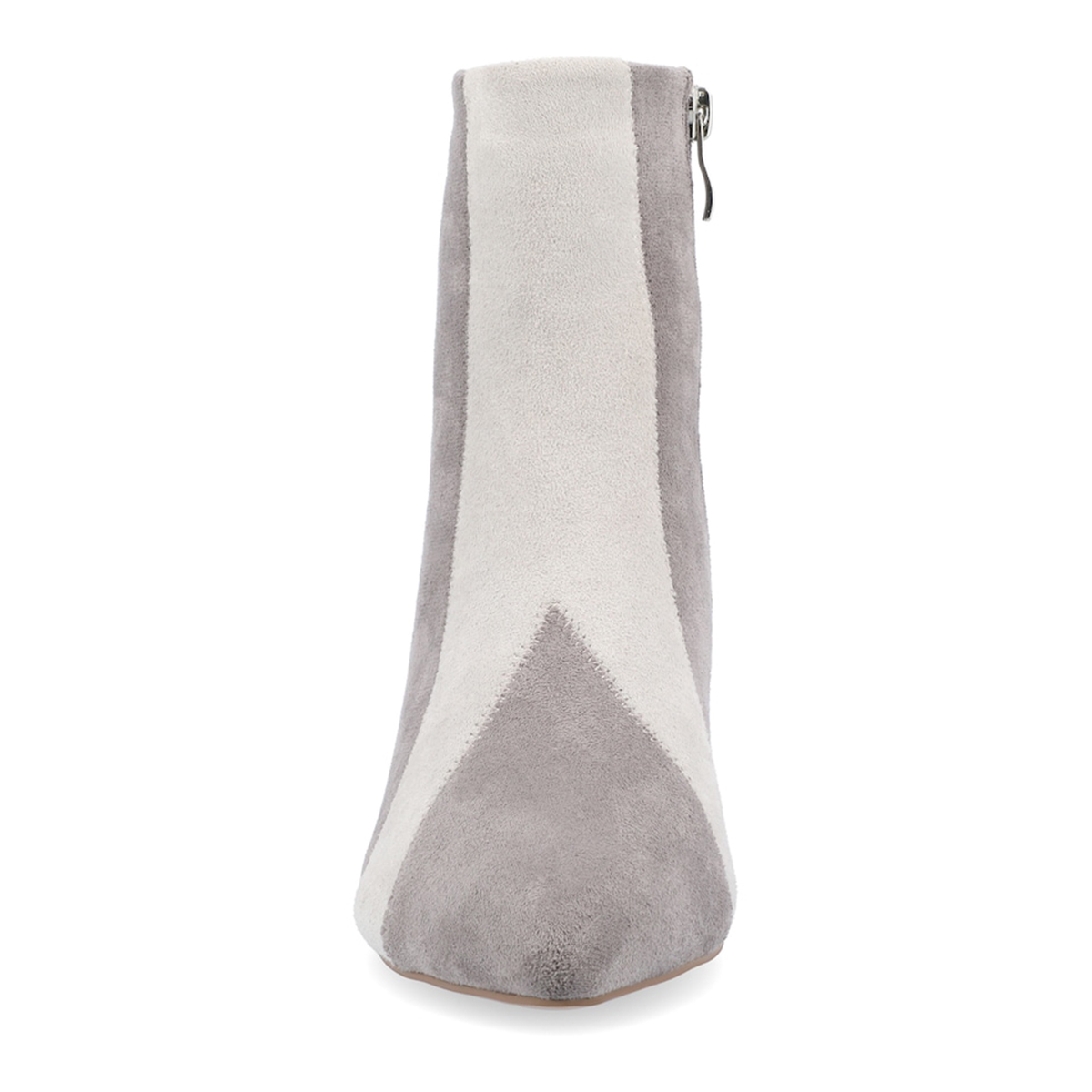 • Special Designs: Gray and white ankle boots with faux suede sophistication, side-zip closure and a rhinestone embellished block heel