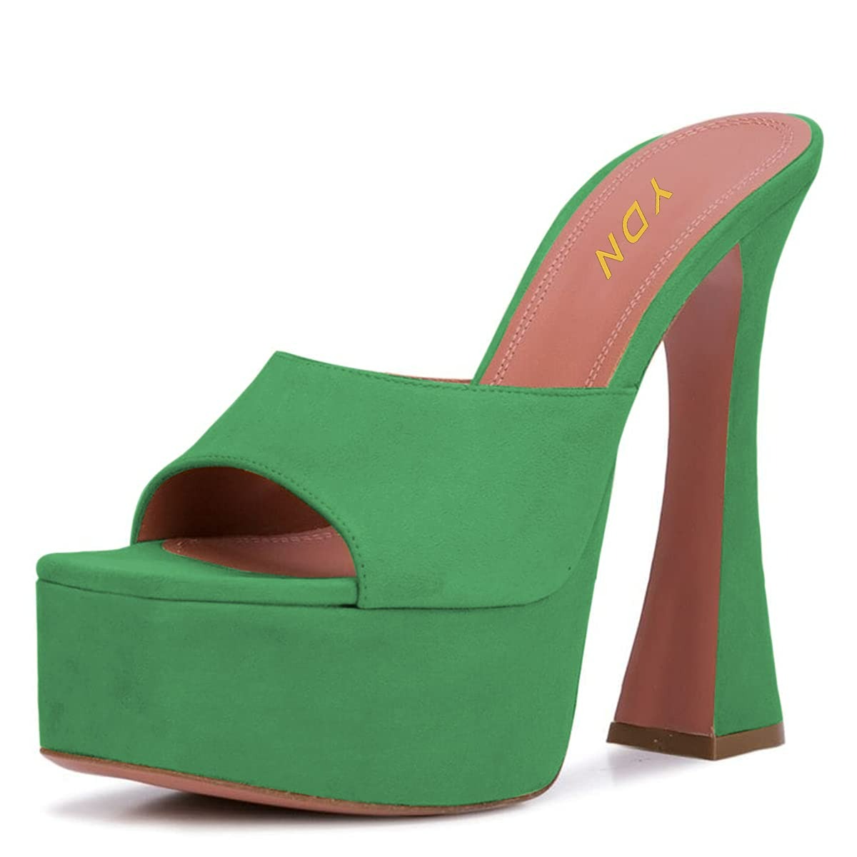 Green Flared High Heel Wide Strap Square Toe Platform Mules Sandals