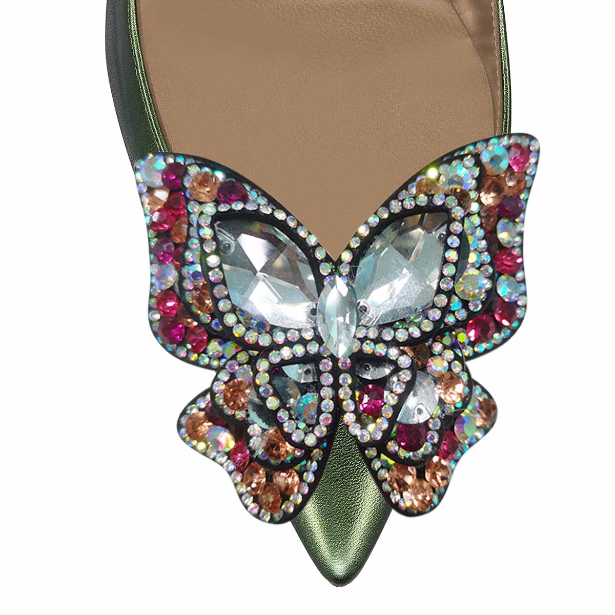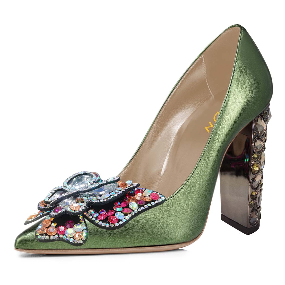 Green Pointed Toe Rhinestone Butterfly Chunky Heel Pumps for Women