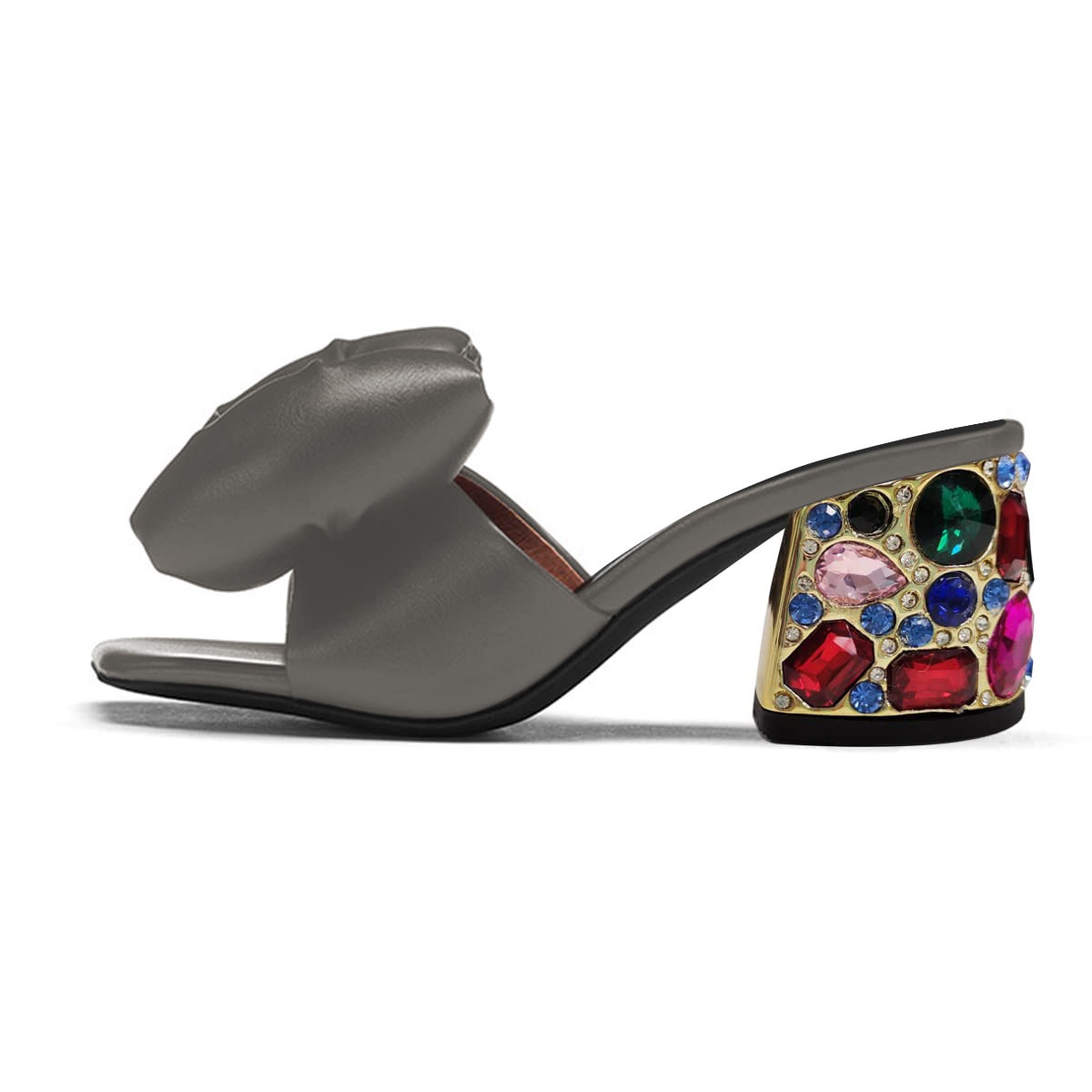 Grey Square Toe Decorative Heel Rhinestone Mules Shoes with Bow
