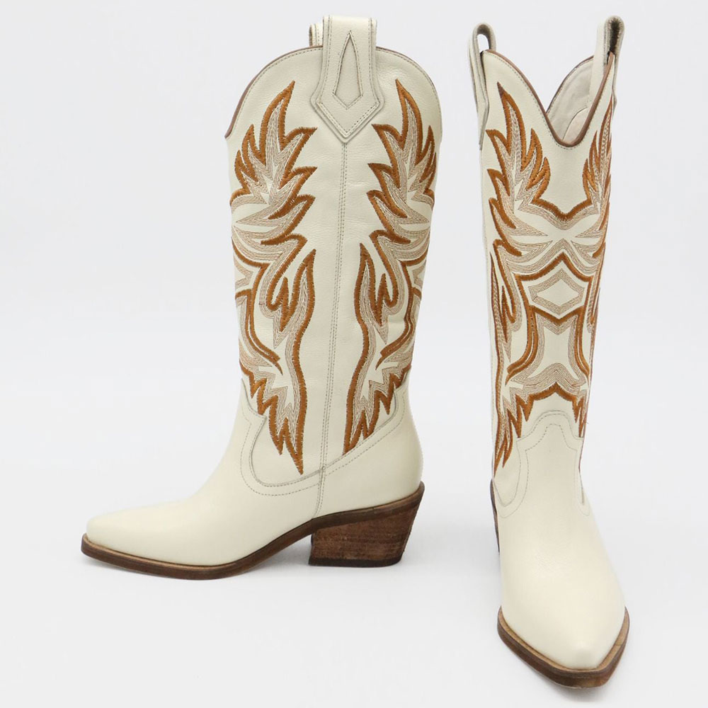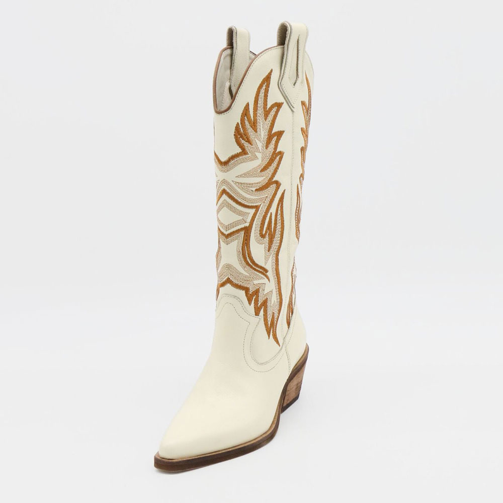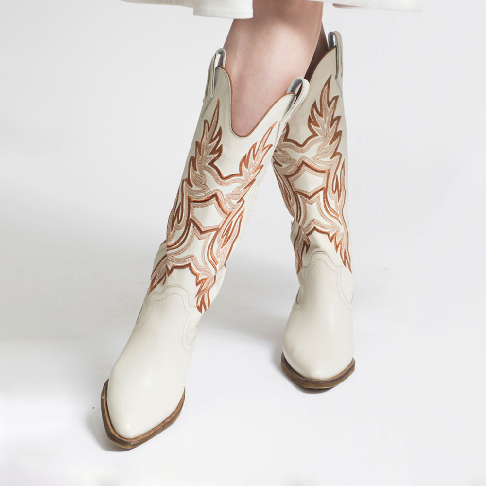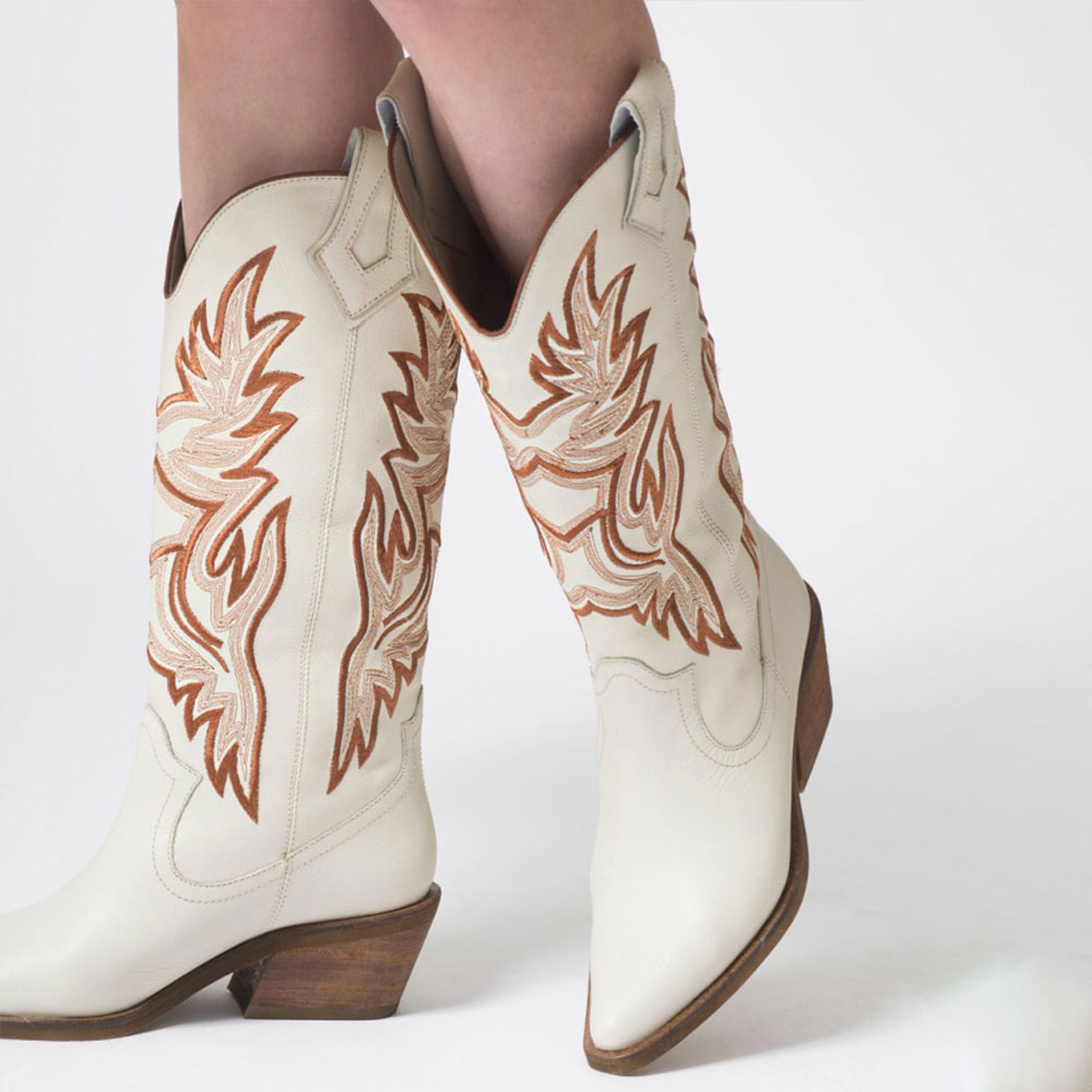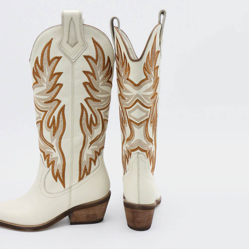 Special Designs: The ivory mid-calf cowgirl boots feature beautiful embroidery and a comfortable chunky heel.