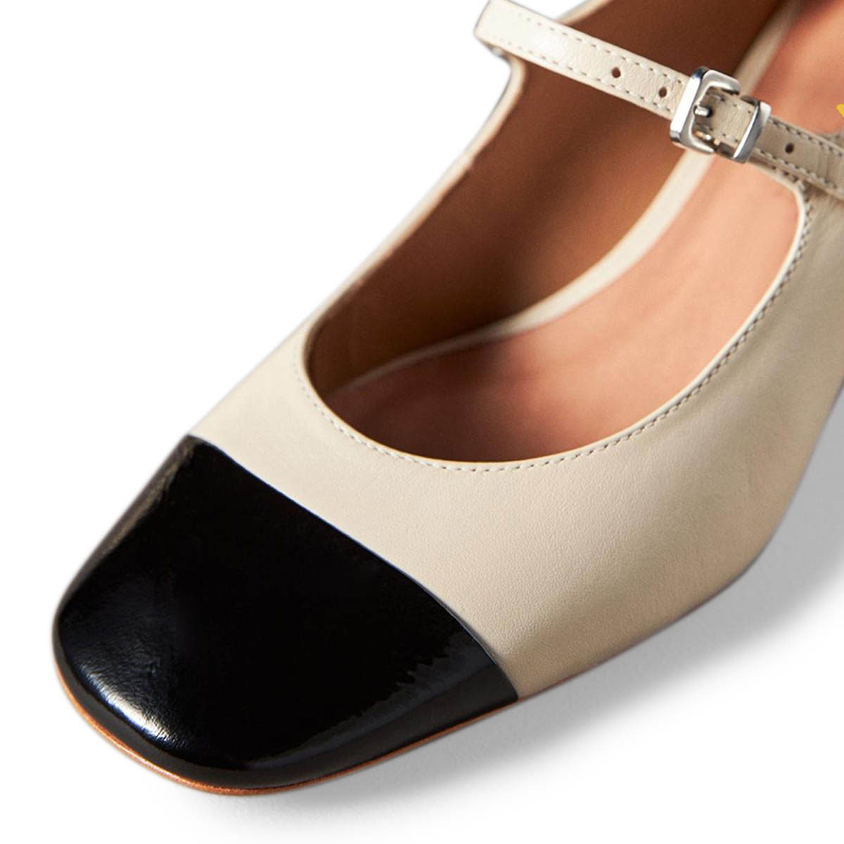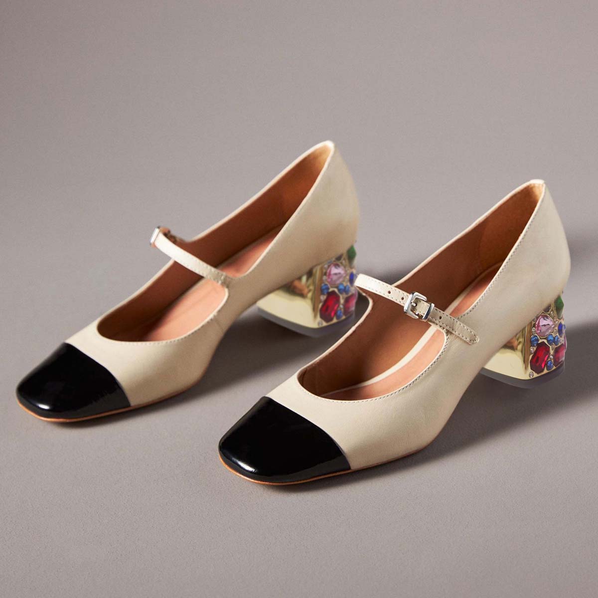 Special Designs: Ivory mary janes featuring a black square toe, an adjustable buckle fastening strap and a decorative heel