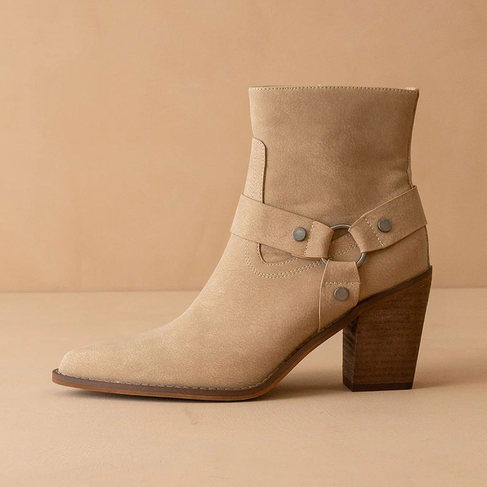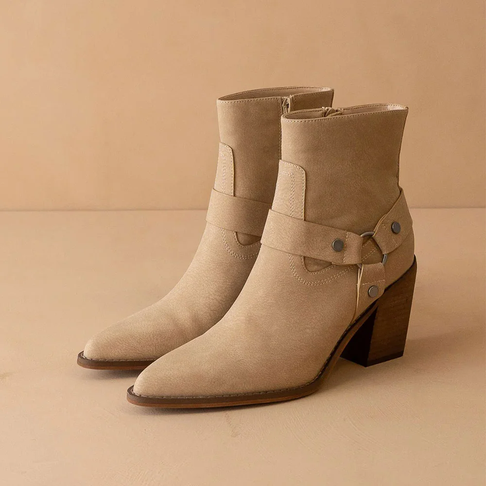 Khaki Pointed Toe Studded Block High Heeled Ankle Boots with Zipper