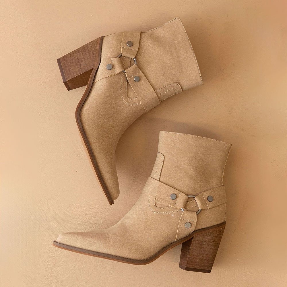Special Designs: The ankle boots feature a ring, a stud, and a high heel design.