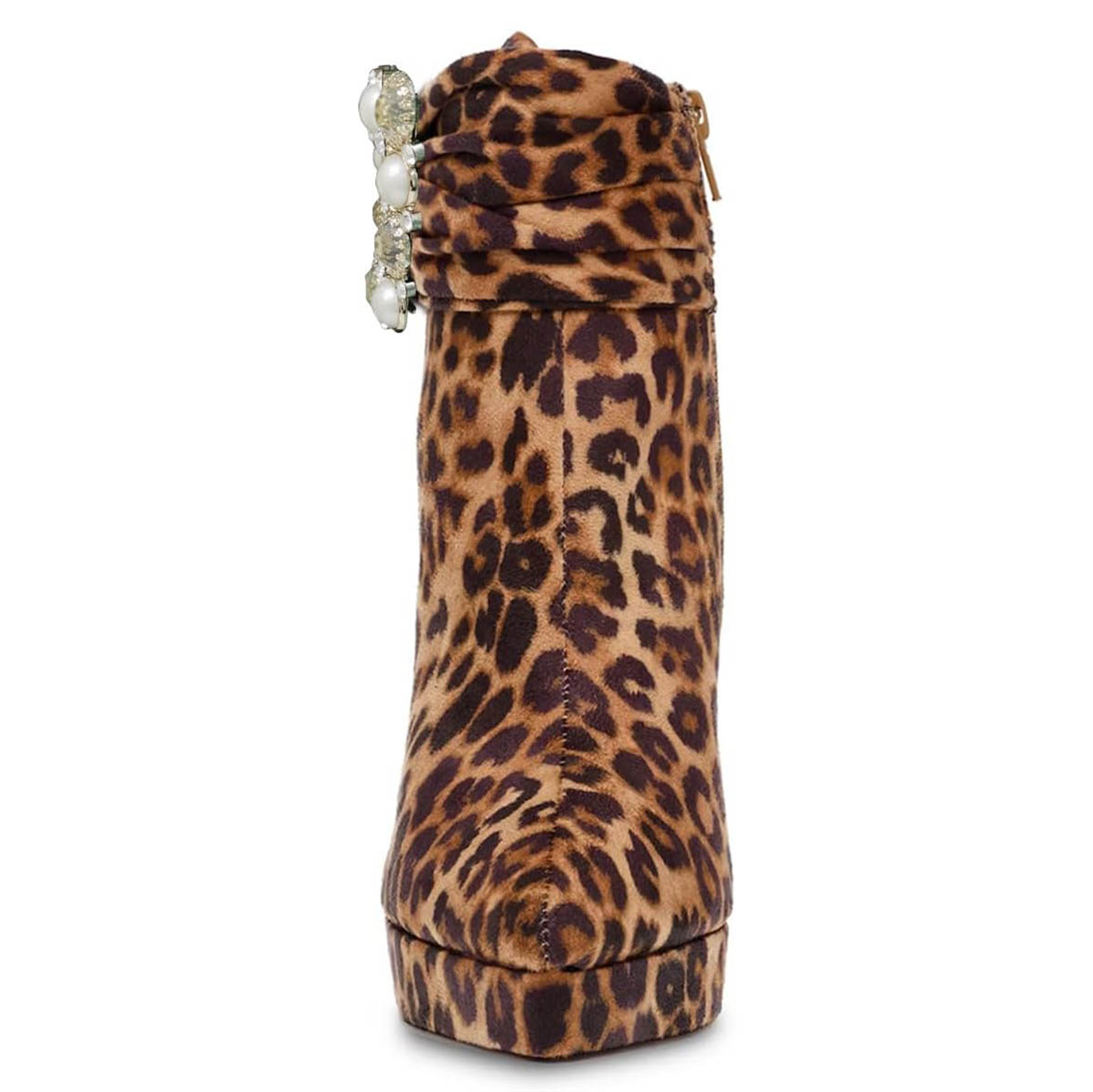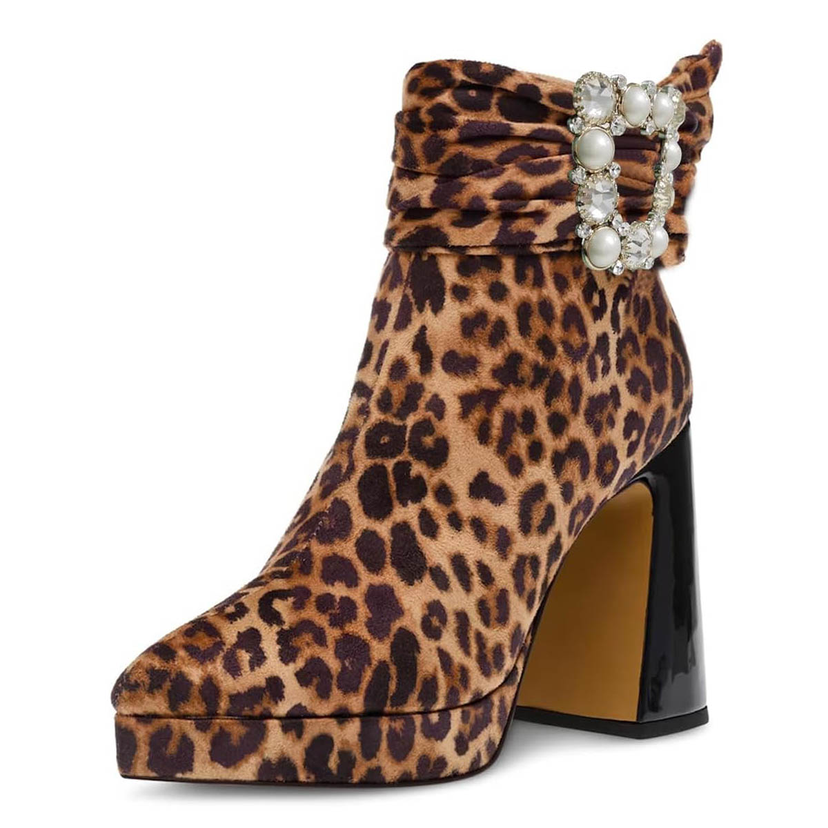 Leopard Print Pointed Toe Chunky Heel Pearls Buckle Ankle Boots