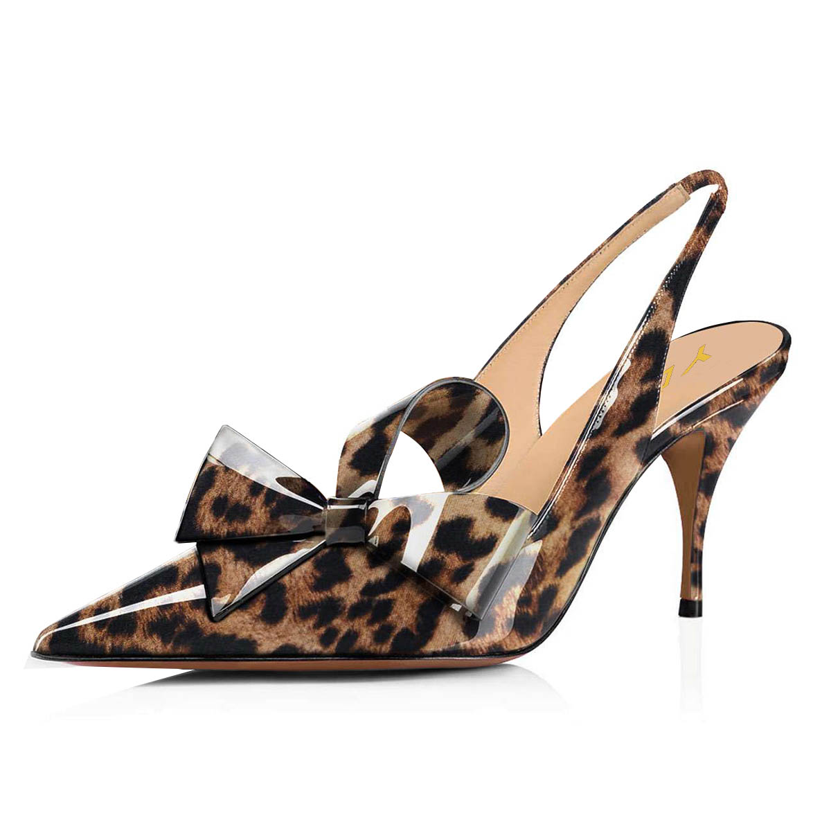 Special Designs: The patent leather leopard print pointed-toe slingback pumps feature a bow embellishment and a stiletto heel.