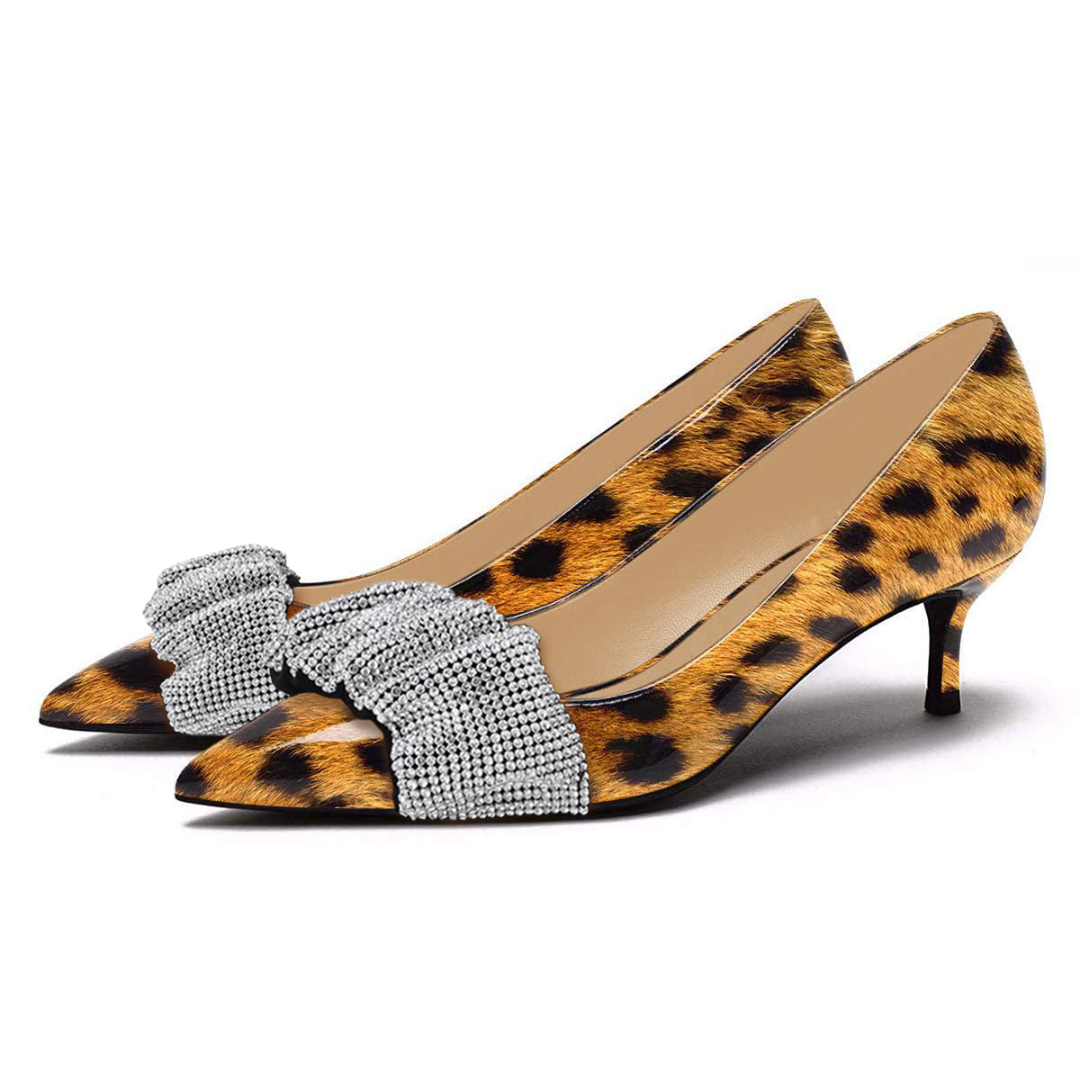 Special Designs: Leopard printed pumps with patent leather sophistication and sparkling rhinestone embellishment.