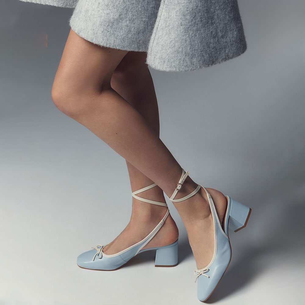 Light Blue Block Heel Bow Square Toe Ankle Wrap Strap Pumps Shoes