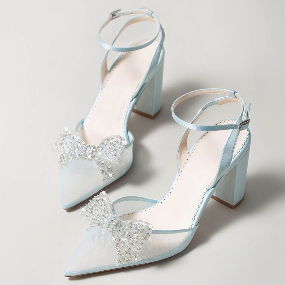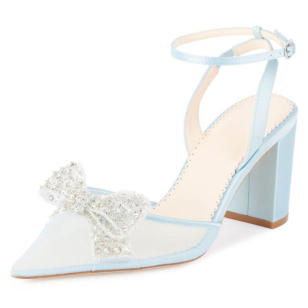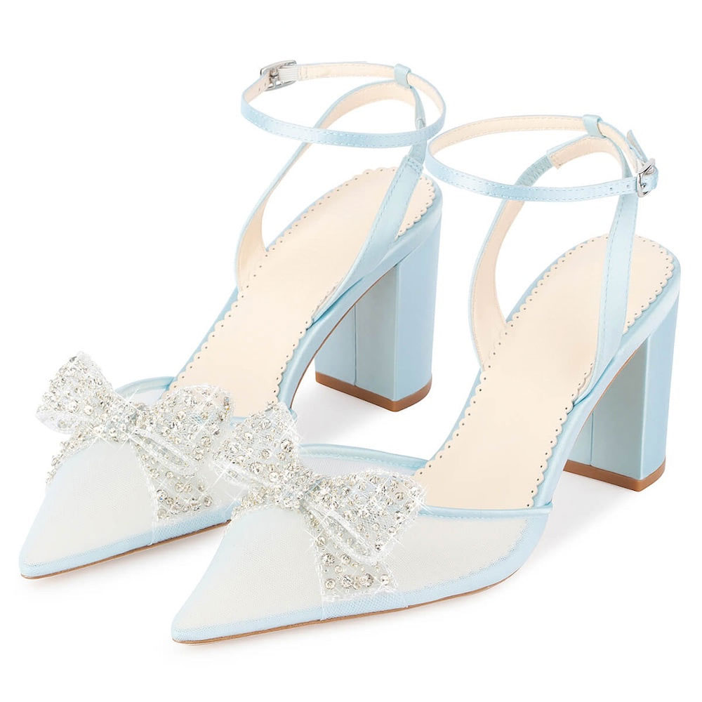 Light Blue Mesh Chunky Heel Pointed Toe Rhinestone Bow Wedding Shoes