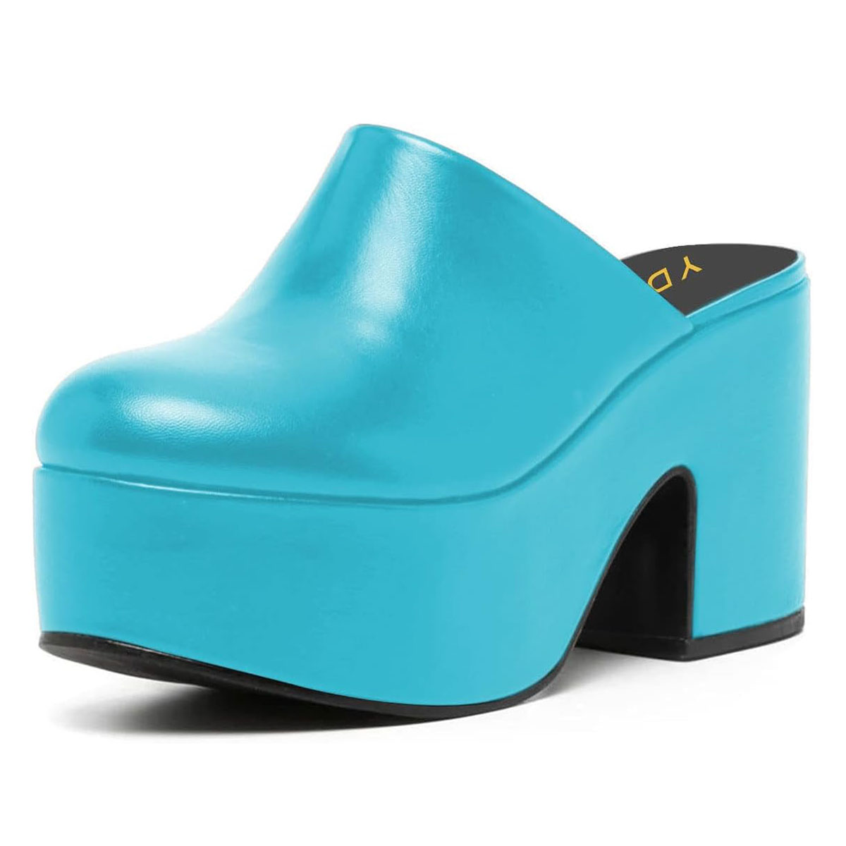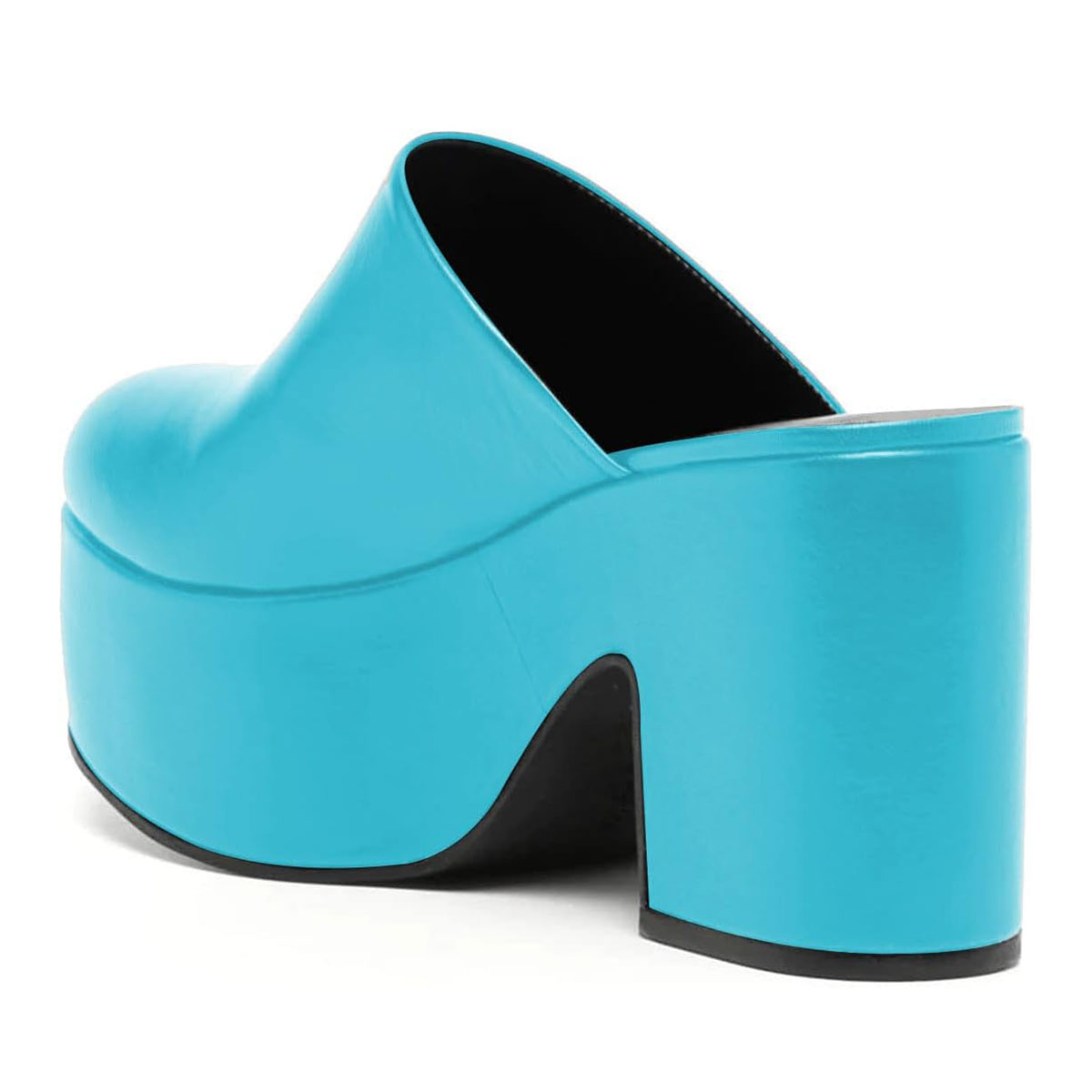Light Blue Vegan Leather Chunky Heel Round Toe Platform Mules