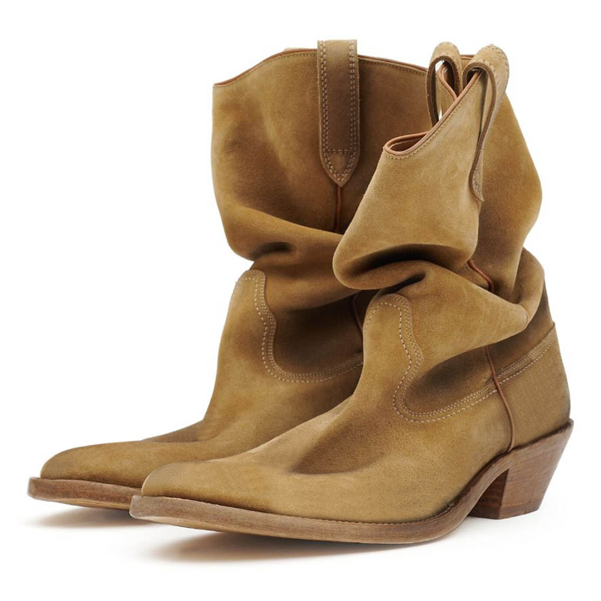 Special Designs: Light brown boots featuring classic side loops and a low block heel