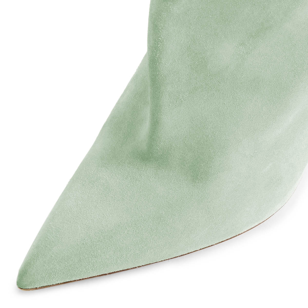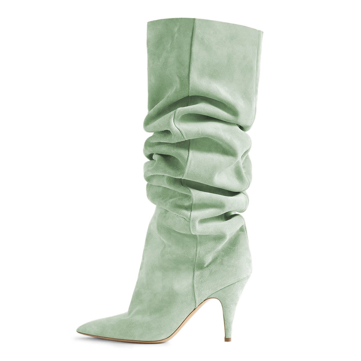 Special Designs: The light green keen-high slouch boots feature a beautiful and fresh color of vegan suede and a comfortable high heel.
