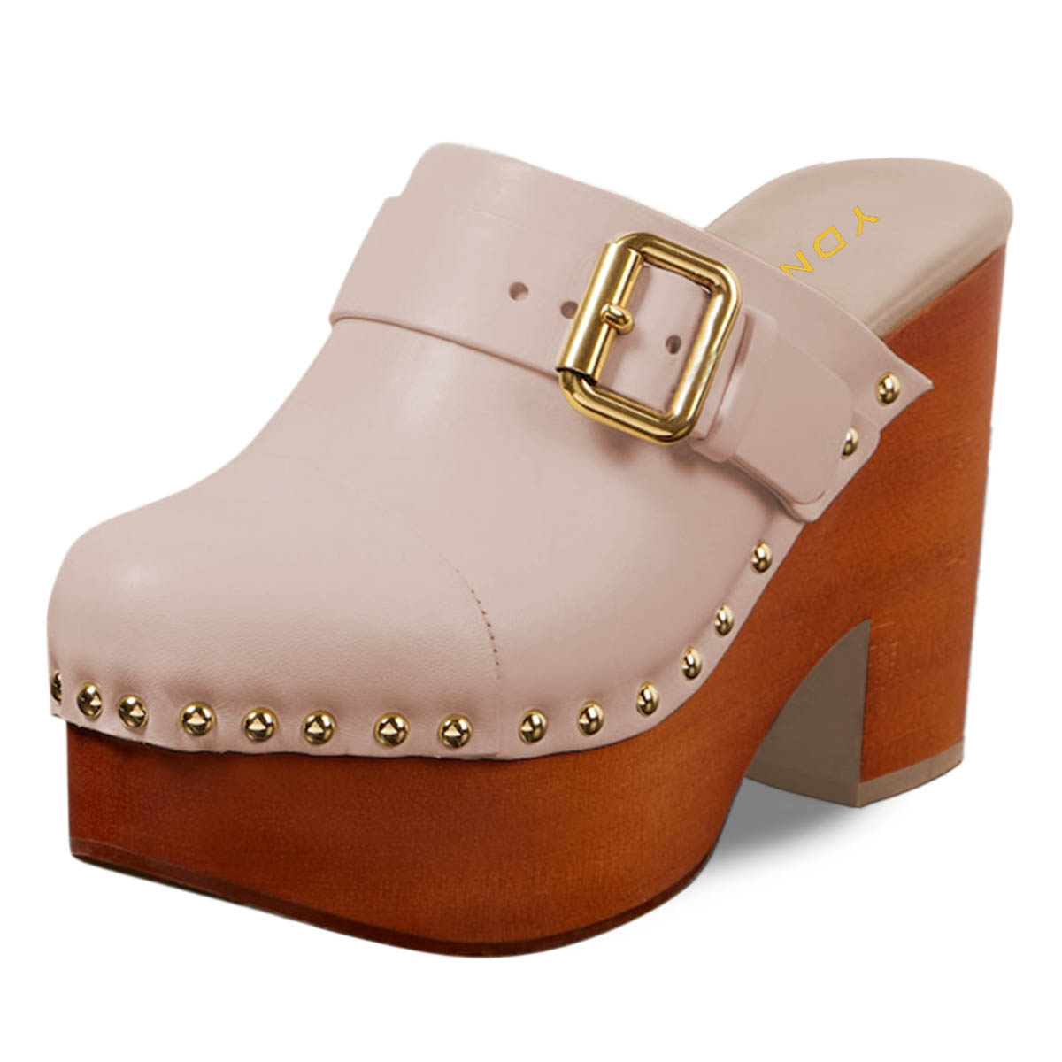 Special Designs: The round-toe chunky heel platform mules feature a buckle strap and stud embellishment.