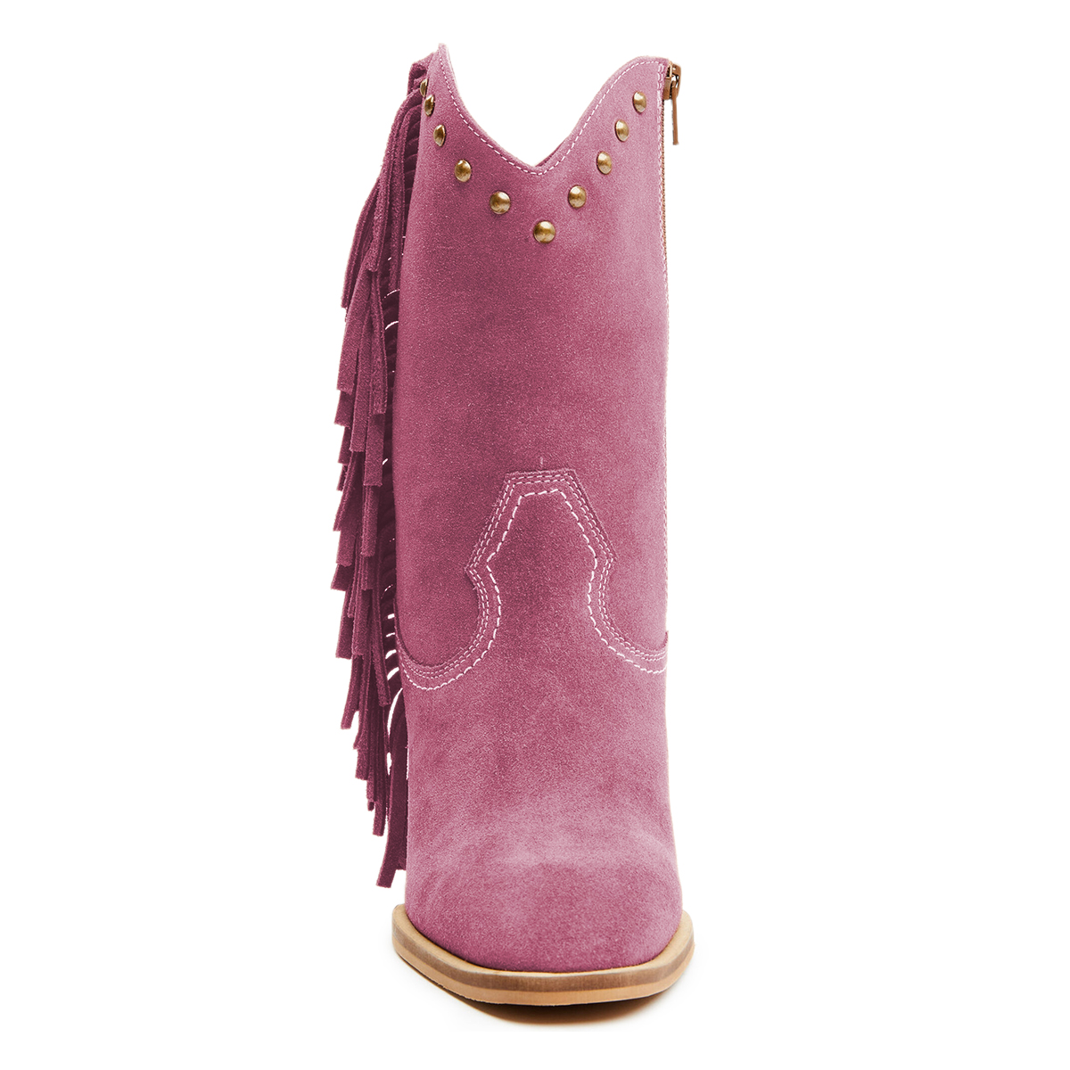 Special Designs: Magenta ankle boots featuring a fringe inlay, stud embellishment, classic block heel and side-zip closure.