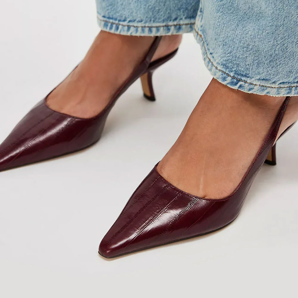 Maroon Faux Leatehr Pointed Toe Buckle Pumps Heels with Slingback