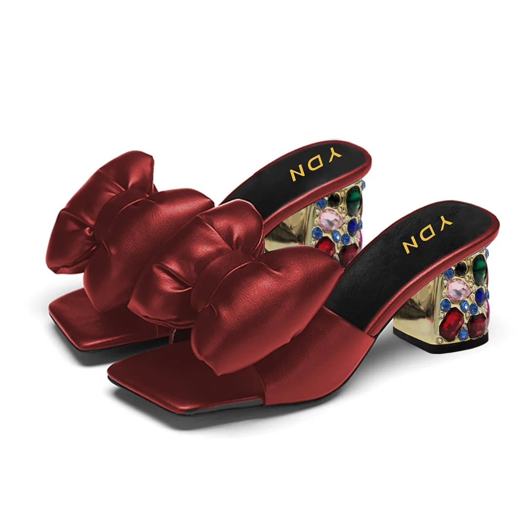 Maroon Open Square Toe Wide Band Rhinestone Bow Mules for Women