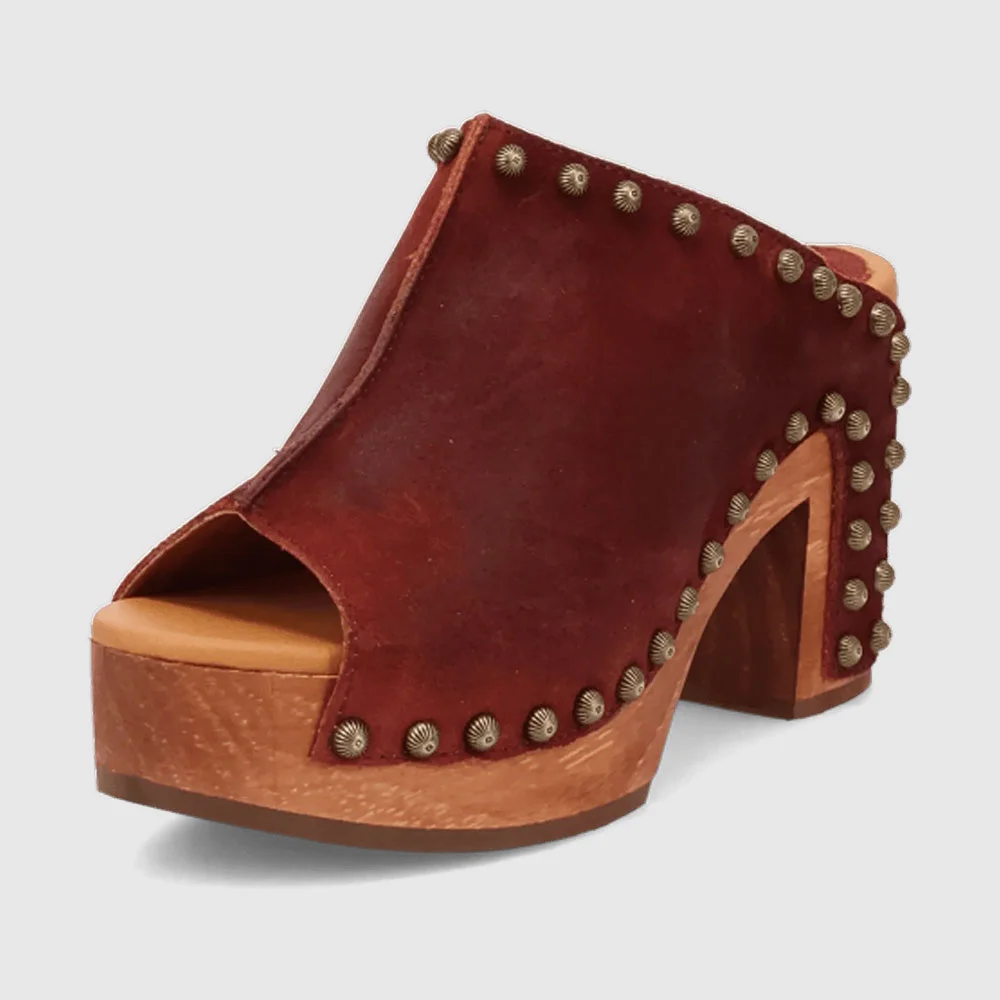 Maroon Peep Toe Studded Clogs Slip On Platform High Heels Sandals